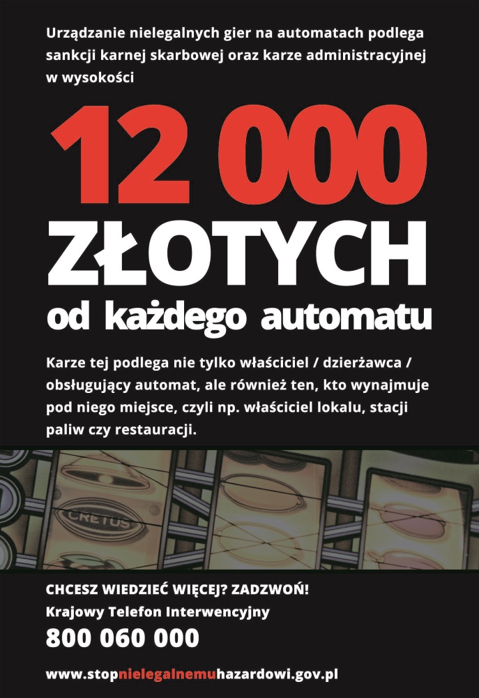 • Osoba urządzająca lub prowadząca gry na automatach wbrew przepisom ustawy o grach hazardowych podlega również karze pieniężnej w wysokości 12 tys. złotych od każdego automatu. Dotyczy to również właścicieli lokali, którzy wynajmują powierzchnie organizatorom gier.