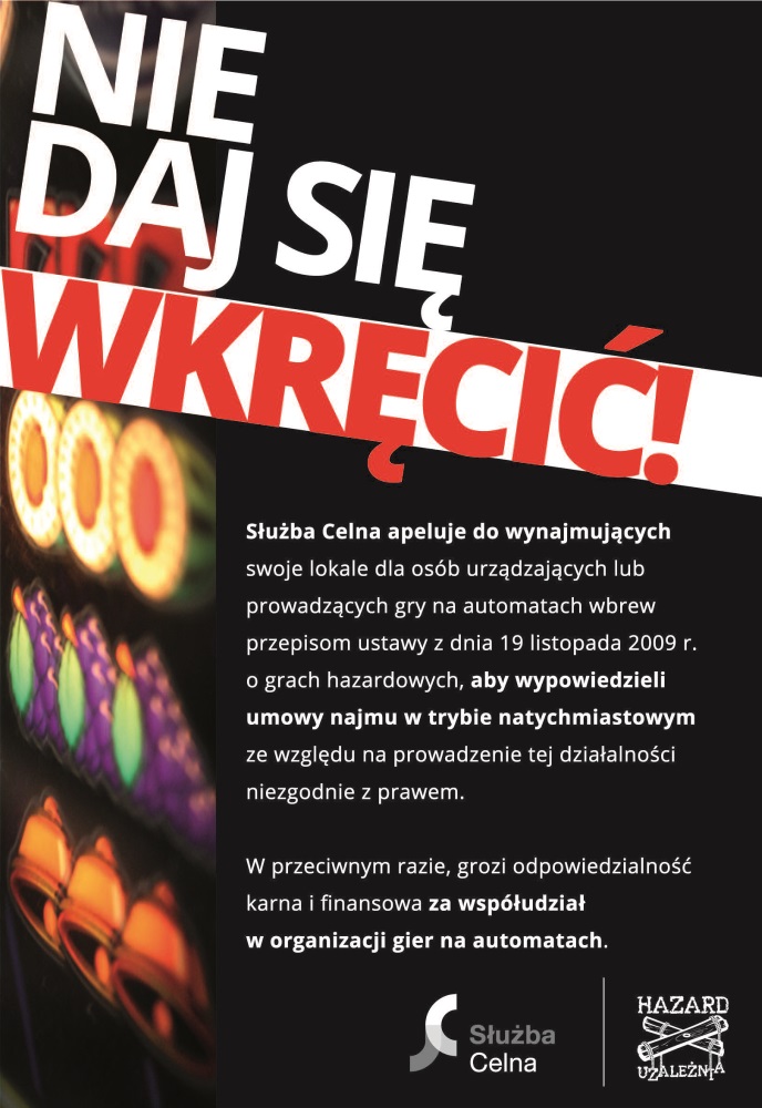 Służba Celna apeluje do wynajmujących swoje lokale dla osób urządzających lub prowadzących gry na automatach wbrew przepisom ustawy z dnia 19 listopada 2009 r. o grach hazardowych, aby wypowiedzieli umowy najmu w trybie natychmiastowym ze względu na prowadzenie tej działalności niezgodnie z Ustawą o grach hazardowych. W przeciwnym wypadku, w sytuacji kontroli dokonywanej przez Służbę Celną wynajmujący z mocy prawa znajdzie się w gronie osób uznanych za organizatorów gier na automatach i obciążony karą administracyjną w wysokości 12.000 zł od jednego automatu.