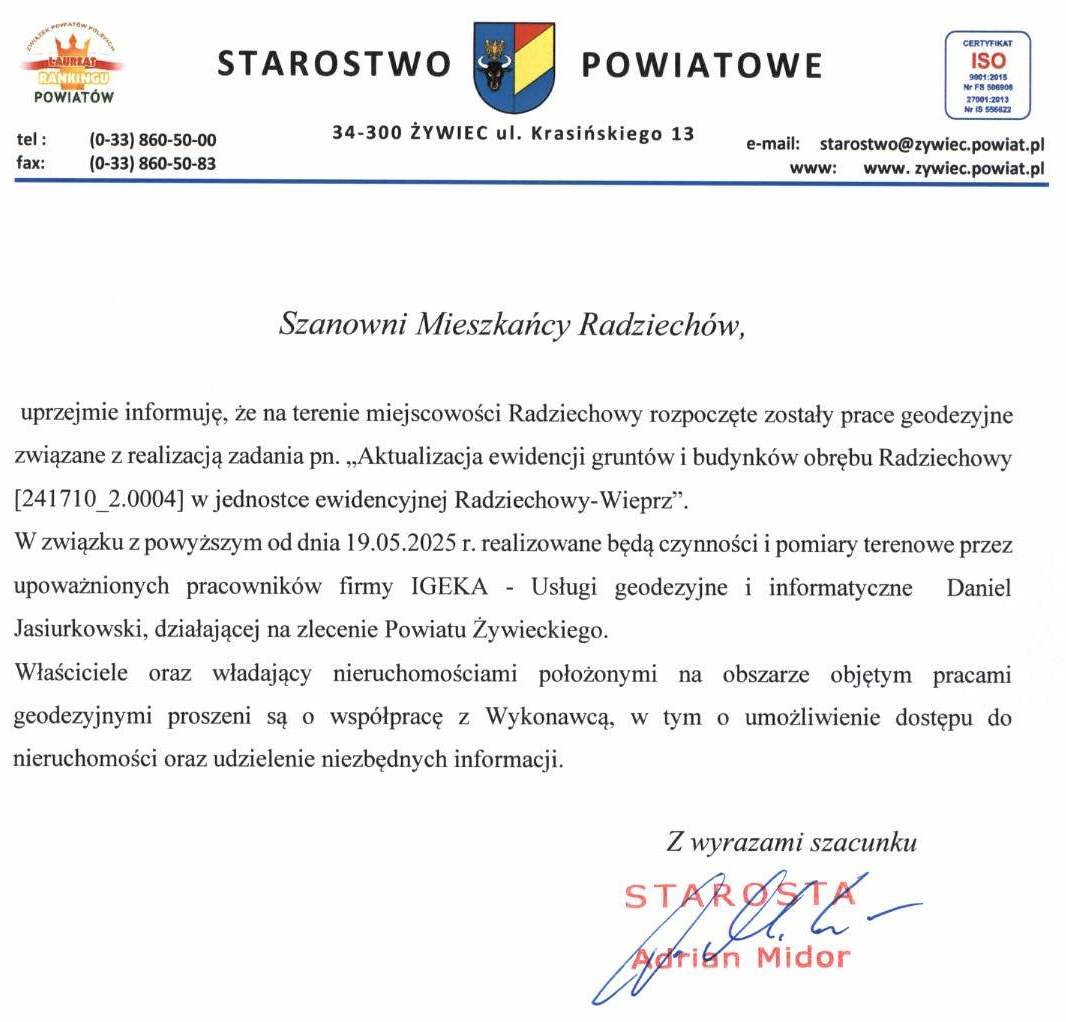 W związku z powyższym od dnia 19.05.2025 r. realizowane będą czynności i pomiary terenowe przez upoważnionych pracowników firmy IGEKA - Usługi geodezyjne i informatyczne Daniel Jasiurkowski, działającej na zlecenie Powiatu Żywieckiego.