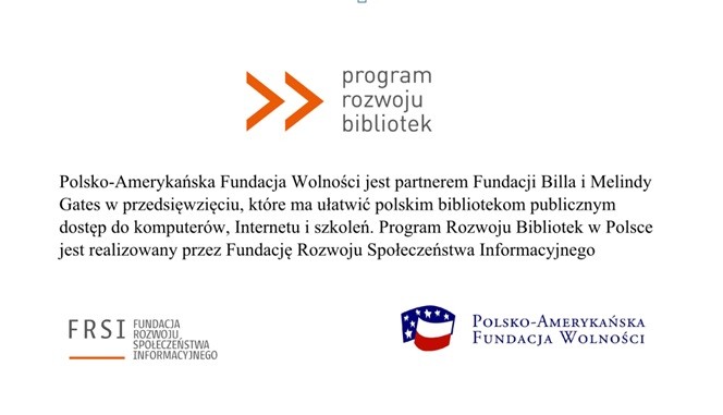 Podjęte działania nie doszłyby do skutku, gdyby nie dofinansowanie Polsko-Amerykańskiej Fundacji Wolności w ramach Programu Rozwoju Bibliotek, wsparcie rzeczowe i finansowe naszych partnerów, zaangażowanie mieszkańców.