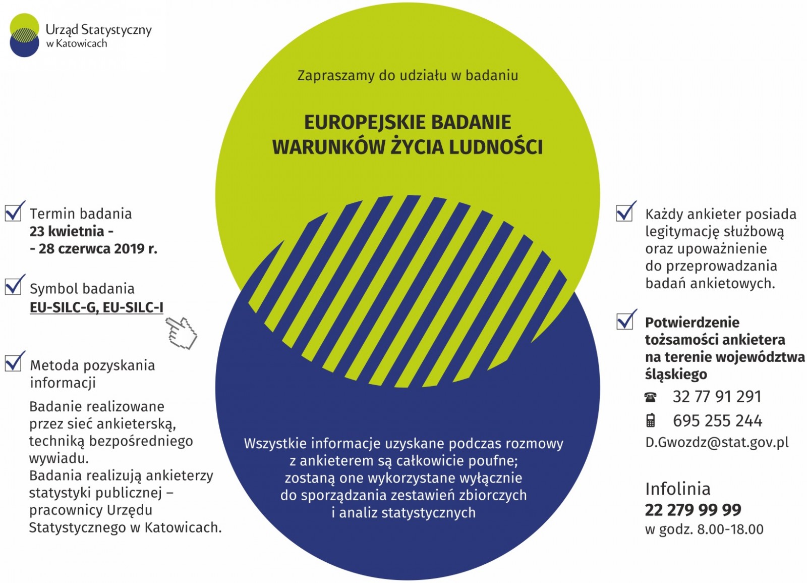 W ramach stałego informowania o realizacji na terenie województwa śląskiego badań ankietowych, prowadzonych przez ankieterów – pracowników Urzędu Statystycznego w Katowicach przekazujemy ogólny plakat o badaniu ankietowym EU-SILC (Europejskie Badanie Warunków Życia Ludności) przeprowadzanym w dniach od 23 kwietnia do 28 czerwca 2019 r.