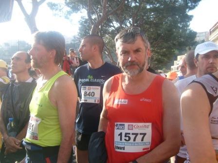 Wspaniała słoneczna pogoda i start z zatoki jachtowej Monte – Carlo, wśród palm z pola startowego Formuły-1 pozostanie na długo w pamięci biegaczy. Maratończycy ruszyli torem Formuły-1 przez tunele, by po pokonaniu pierwszych wzniesień pojawić się na trasie lazurowego wybrzeża. Od początku na prowadzeniu znajdowali się Kenijczycy. Trasa prowadziła przez Monako – Riviere Francuską następnie Włochy i powrót. Gdyby nie tablice ze znaczkiem Unii Europejskiej trudno by było zorientować się gdzie przebiega granica poszczególnych państw. Na trasie mnóstwo kibiców, zespoły muzyczne i kapele, które grając różną muzykę zachęcały biegaczy do walki. Miła i sympatyczna atmosfera wspaniałe widoki na Morze Liguryjskie i pasma górskie wraz z cudowną roślinnością, oraz różnymi gatunkami palm. Do 17 kilometra wszystko przebiegało zgodnie z planem, prawie jak w szwajcarskim zegarku, gdy nagle poczułem piekielny ból w prawym udzie. Próbowałem rozmasować sobie bolącą nogę, aby biec dalej, jednak ból był bardzo mocny, że po przemaszerowaniu około 2 kilometrów udałem się na punkt medyczny. Po odczekaniu około 10 minut, na pomoc bez rezultatu, stwierdzając, że dalsze oczekiwanie nic nie zmieni postanowiłem pobiec dalej, wtedy zareagował lekarz serwisu. Masażyści znów mieli problem bo było ich 6 kto się ma mną zająć, po 1 minutowym masażu, który praktycznie nic nie dał. Ruszyłem dalej ciągnąc prawą nogę. Przeżycia jakie mi towarzyszyły od tego momentu trudno opisać, jadąc 2000 kilometrów w jedną stronę trudno by było nie ukończyć tego maratonu. Na trasie mijali mnie kolejni zawodnicy, ja dalej walczyłem z przenikliwym bólem i dystansem. Do głowy przychodziły różne myśli, ale najgorsze było to, że mogę nie ukończyć mojego 90 biegu maratońskiego. Na 28 kilometrze mijało mnie małżeństwo Walczaków z Leszna, którzy podali mi tabletkę przeciwbólową i podtrzymali na duchu. I tak podziwiając krajobrazy dopingowany przez kibiców i wyprzedzany przez zawodników dotarłem na ulice Monako. Do mety zostało już tylko 2 km, wtedy już byłem pewny, że wbiegnę, a właściwie doczłapie na słynny stadion Louis II Monaco. Na mecie oczekiwała już na mnie cała nasza grupa z Jackiem Łabudzkim najlepszym naszym maratończykiem, który pokonał dystans w 2 godz.59 min na 43 miejscu. Ja zaś utykając próbując finiszować zebrałem wielkie brawa za upór