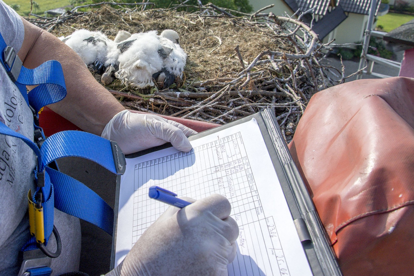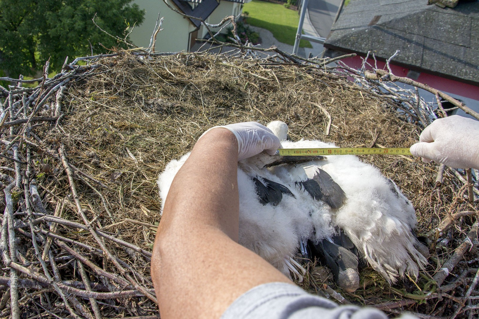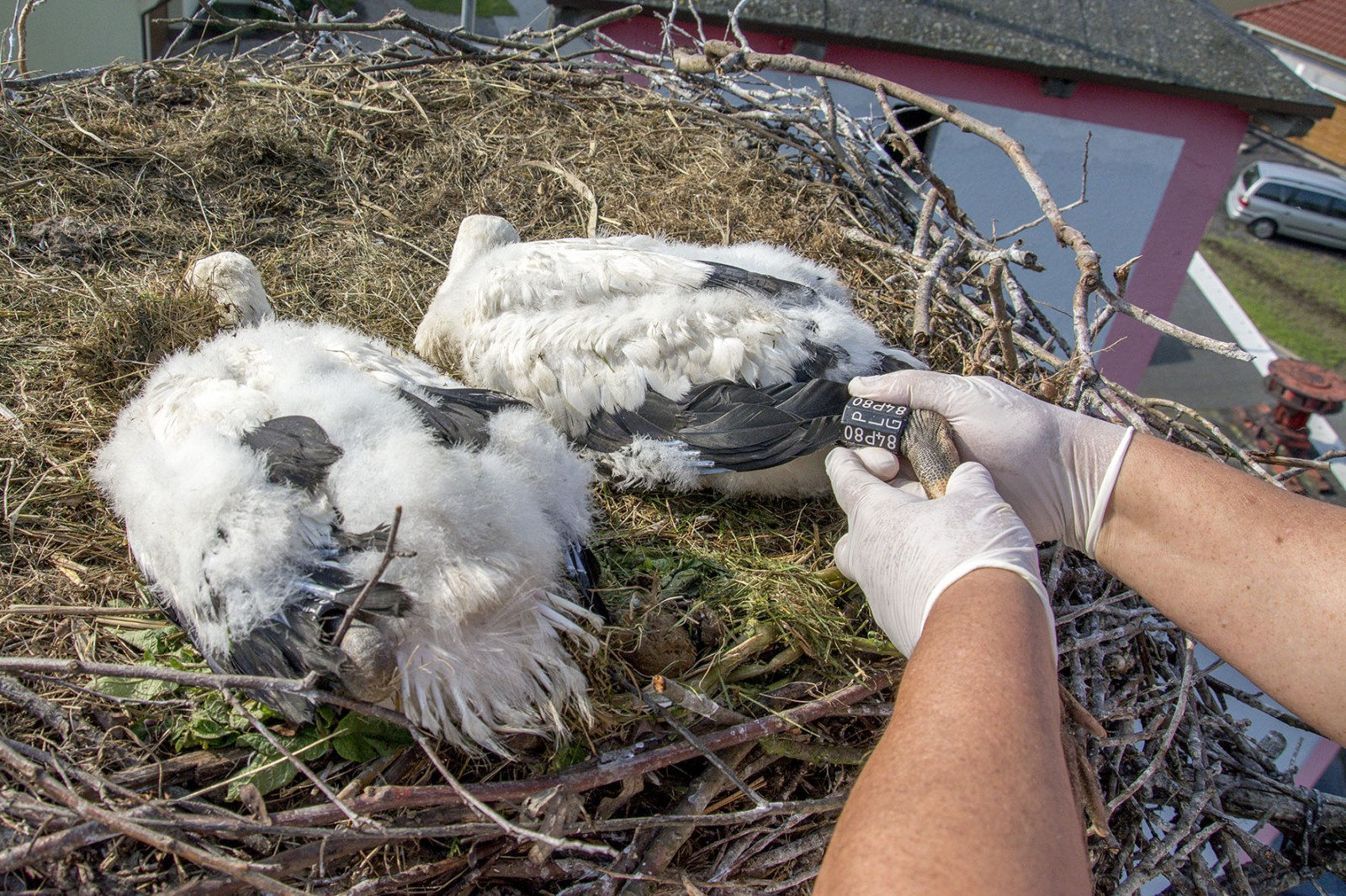 Pisklęta bocianów są w tej chwili we właściwym wieku, aby założyć im obrączki. Na widok pojawiającego się w gnieździe obrączkarza zamierają w bezruchu udając, że są martwe. Są też na tyle duże, że założona obrączka nie zsunie im się z nogi. Grupa obrączkarzy i ornitologów wywożona jest podnośnikami TAURONA na gniazda, aby założyć na bocianie nogi dwie obrączki – metalową i plastikową. Na każdej obrączce znajduje się skrócony adres centrali obrączkowania oraz niepowtarzalny kod literowo-cyfrowy. Jest on pewnego rodzaju numerem pesel ptaka, a wszystkie informacje o tym osobniku przypisane do nadanego mu przy obrączkowaniu numeru. W ten sposób nawet po wielu latach można zestawić wszystkie dane o nim. Porównując zebrane informacje naukowcy zdobywają wiedzę o sposobie przemieszczenia się danego ptaka, długości życia, posiadanym potomstwie i innych aspektach jego biologii. Jest to długotrwała, ale na tę chwilę, skuteczna metoda badawcza.