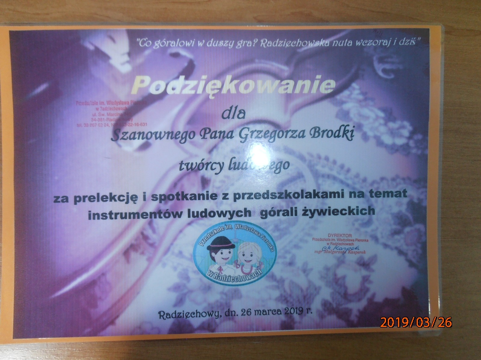 Warsztaty muzyczne przeprowadzone przez Panią Brygidę Murańską i Pana Grzegorza Brodkę w dniach 25 i 26 marca 2019r. sprawiły wiele radości  przedszkolakom i ich wychowawczyniom. Serdecznie dziękujemy za poświęcony czas i chęć dzielenia się swoją pasją, za wsparcie w poznawaniu i pielęgnowaniu pięknych tradycji regionalnych.