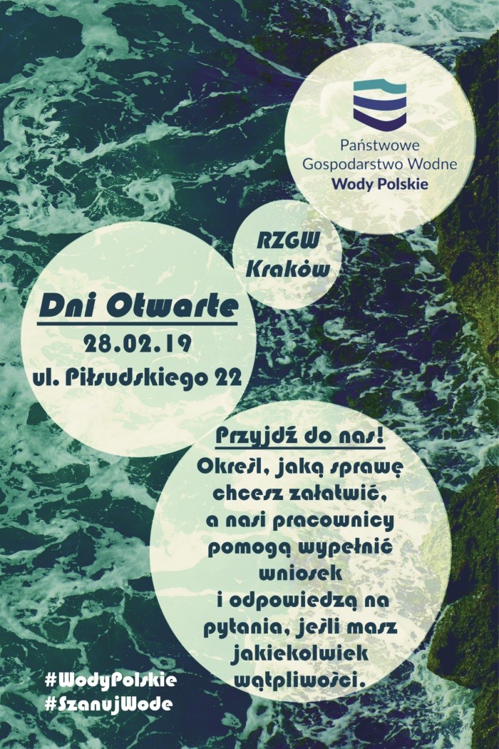 Państwowe Gospodarstwo Wodne Wody Polskie Regionalny Zarząd Gospodarki Wodnej w Krakowie zaprasza do udziału w Dniach Otwartych. W każdy ostatni czwartek miesiąca, w godzinach od 8.00 do 14.00 nasi pracownicy będą udzielać wszelkich informacji oraz porad związanych z gospodarką wodną - odpowiedzą na Państwa pytania, pomogą wypełnić wniosek, sprawdzą niezbędną dokumentację.