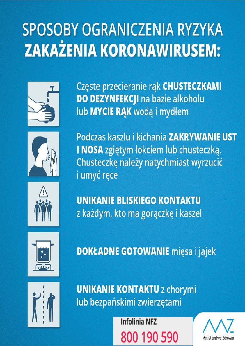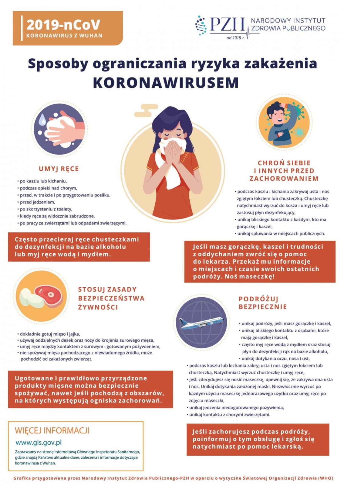 Działania profilaktyczne w ramach ograniczenia ryzyka zakażenia koronawirusem Dodano: 02.03.2020 r. Kategoria: Informacje ogólne Państwowy Powiatowy Inspektor Sanitarny w Żywcu informuje o sposobach ograniczenia ryzyka zakażenia koronawirusem