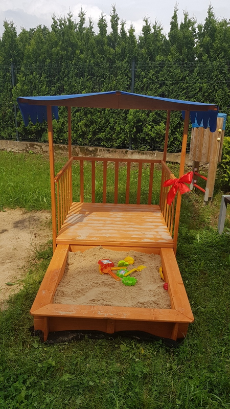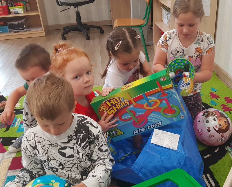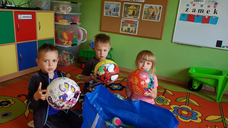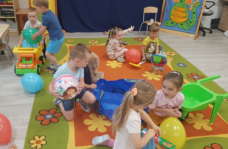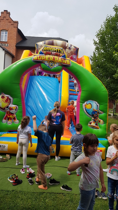 Od samego rana każda grupa została obdarowana prezentami w postaci kolorowych piłek, gier zręcznościowych, badmintonów, dużych plastikowych samochodów, taczek i zestawów zabawek do piasku. Wszystko to spakowane było do dużych oznakowanych toreb, które służyć będą nauczycielom do codziennego przenoszenia sprzętu na plac zabaw. Ponadto nasze place zabaw wzbogaciły się o nową zadaszoną piaskownicę z tarasem, 4 stoliki z ławeczkami i parasolami. Obok przedszkola pojawił się również długo wyczekiwany stojak na rowerki dziecięce. Natomiast w ogrodzie czekał na przedszkolaki piękny, ogromny i bardzo kolorowy dmuchaniec - Psi Patrol, na którym wszystkie przedszkolaki miały okazję wyszaleć się do woli.
