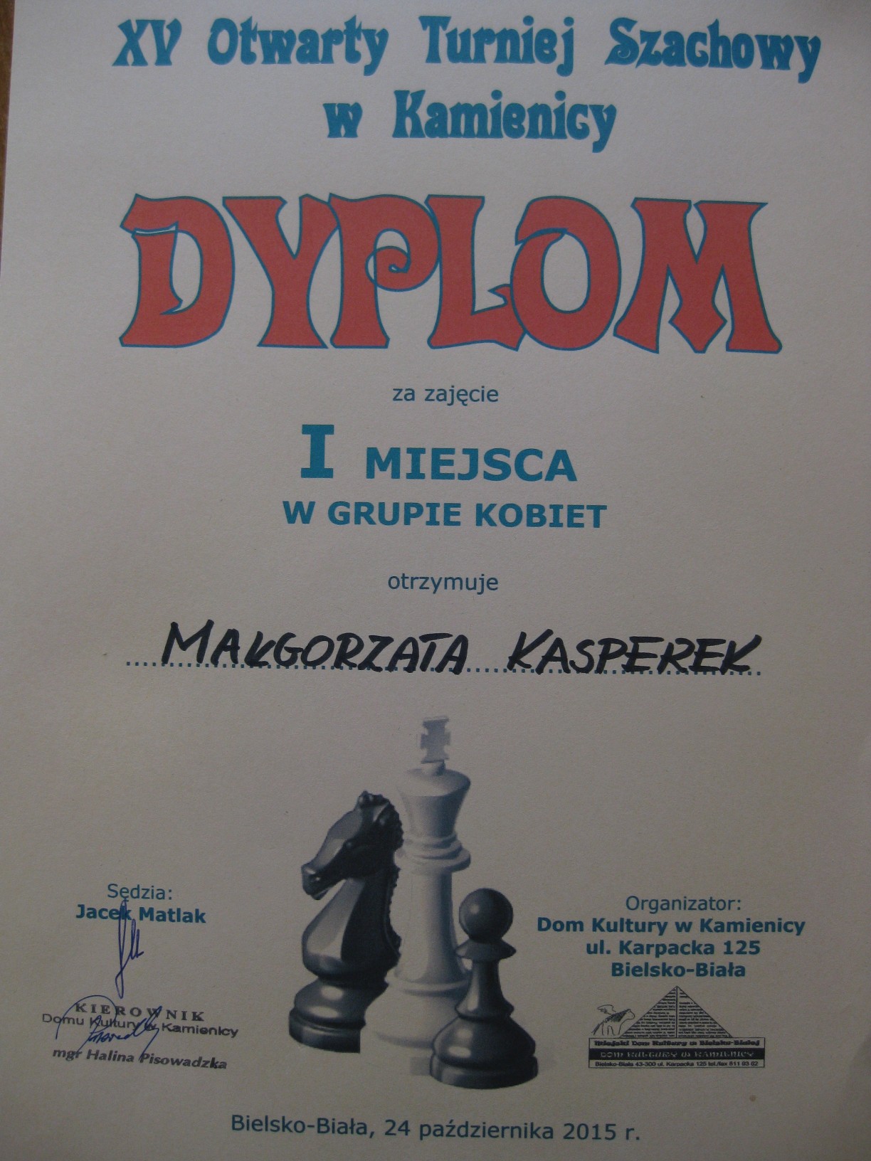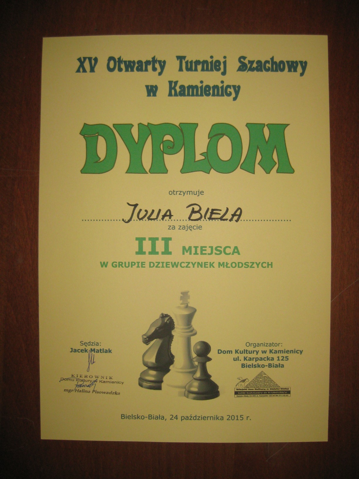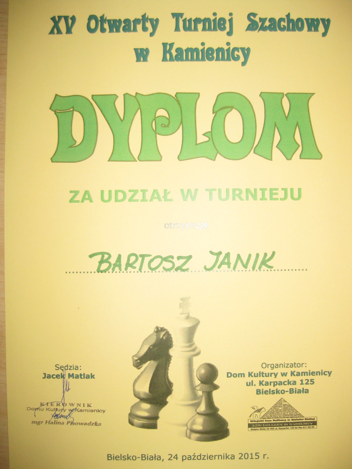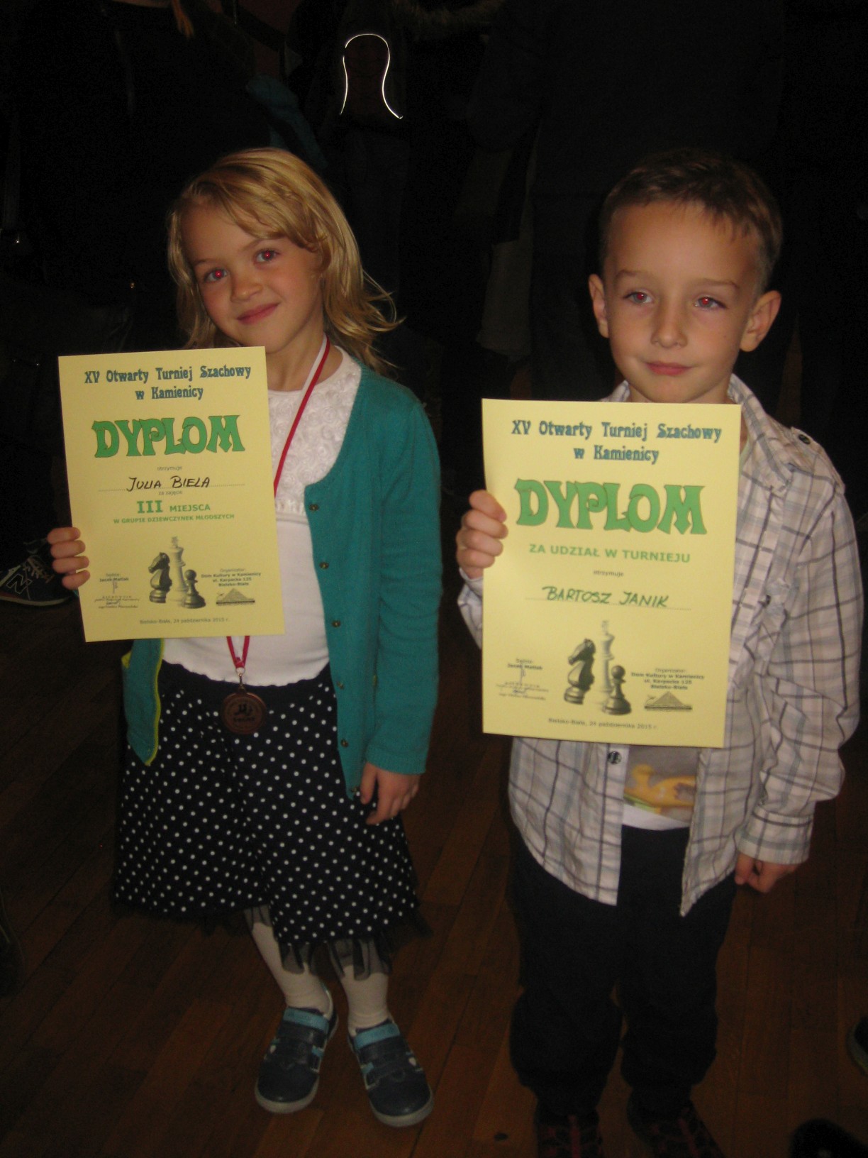Zajęcia prowadzi dyrektor przedszkola mgr Małgorzata Kasperek , posiadająca uprawnienia i przygotowanie metodyczne do nauczania gry w szachy potwierdzone certyfikatem nadanym przez Polski Związek Szachowy. Przedszkole uczestniczy w projekcie ogólnopolskim pod patronatem Polskiego Związku Szachowego i Ministerstwa Edukacji Narodowej „Edukacja przez szachy w szkole”, skierowanym głównie do klas początkowych szkoły podstawowej. Wszystkie nasze starsze przedszkolaki znają podstawowe zasady tej królewskiej gry, a wśród nich odnajdujemy dzieci obdarzone szczególnym talentem w tej dziedzinie. Postanowiliśmy wypromować edukację szachową realizowaną w naszym przedszkolu na szczeblu regionalnym. W dniu 24.10.2015r. nasz przedszkolak Bartosz Janik (6 lat) i tegoroczna absolwentka Julia Biela (7 lat) wzięli udział w turnieju szachowym dla dzieci ze szkół podstawowych i przedszkoli organizowanym przez Dom Kultury w Kamienicy w Bielsku- Białej. Dwójka małych szachistów dzielnie reprezentowała Publiczne Przedszkole w Radziechowach, gdzie na co dzień ćwiczą swoje umiejętności szachowe (Bartek od ponad roku, a Julia już dwa lata). Byli jednymi z najmłodszych uczestników turnieju i bywało, że dane im było walczyć z zawodnikami niemal dwukrotnie starszymi od siebie. Bartek wygrał połowę z siedmiu partii i na 25-ciu zawodników zajął bardzo dobre 13-te miejsce. Dwukrotnie zwyciężył i raz zremisował z chłopcami z piątą kategorią szachową. Natomiast Julia zdobyła trzecie miejsce wśród dziewczynek biorących udział w turnieju. Równolegle do turnieju dzieci odbywał się turniej otwarty dla zaawansowanych szachistów, w którym wzięła udział dyrektor przedszkola Małgorzata Kasperek (I miejsce w grupie kobiet). Młodym szachistom serdecznie gratuluję udanego debiutu w turnieju, dziękuję za tak godne reprezentowanie Publicznego Przedszkola w Radziechowach w tej królewskiej grze i życzę dalszych sukcesów. Dziękuję Pani Joannie Janik i Panu Witoldowi Bieli za poświęcony czas i umożliwienie dzieciom udziału w turnieju. Do zmagań szachowych promujących naszą działalność i talenty wychowanków przygotowuje się kolejna grupa małych szachistów. Natomiast Bartek i Julia w najbliższym czasie zawalczą o uzyskanie V kategorii szachowej.