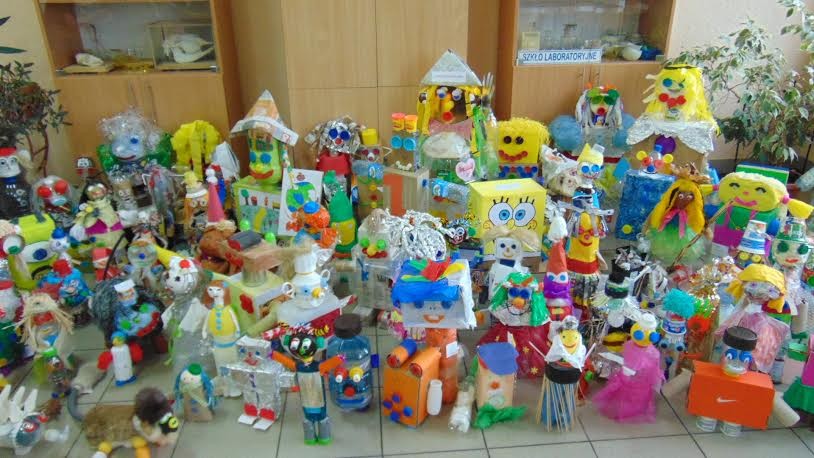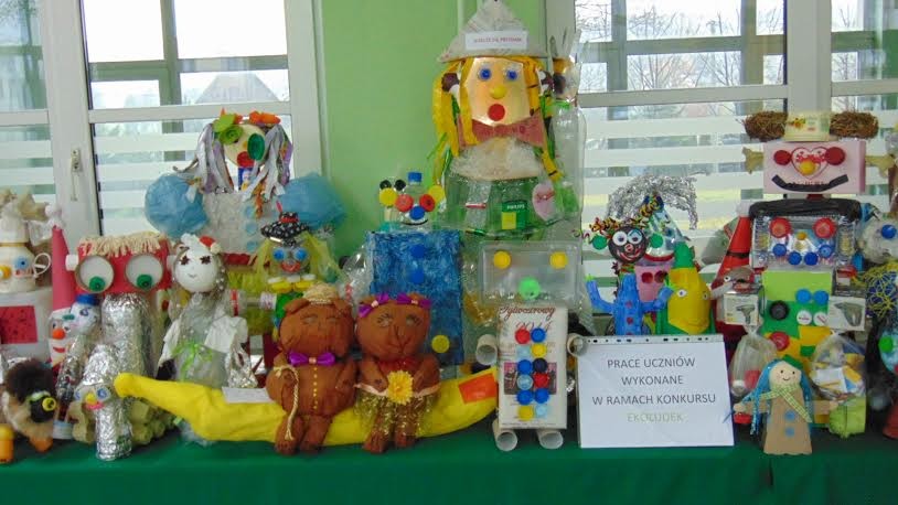 Młodzi artyści wykonali kolorowe ekoludki, czyli stworki z przeróżnych bajek, przybysze z kosmosu, roboty, kukiełki, czarownice, kucharze. Piękne prace zostały zrobione z surowców wtórnych typu: makulatura, puszki, plastikowe butelki, baterie, zakrętki, tworzywa sztuczne, folie oraz z materiałów naturalnych, np. słomy, drewna, wikliny.