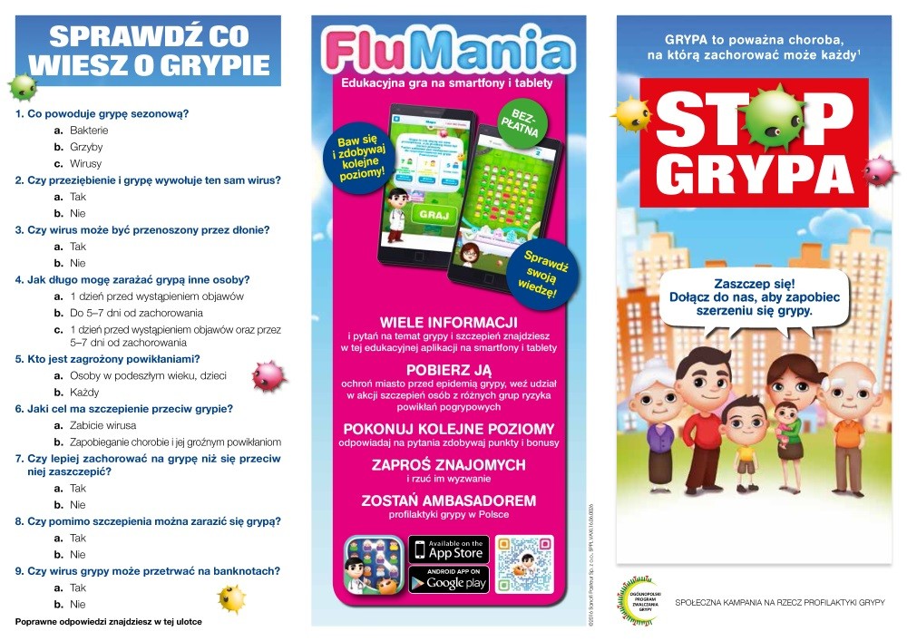 Aplikacja FluMania powstała w ramach szeroko zakrojonych działań na rzecz promocji profilaktyki grypy. Zadaniem graczy jest opanowanie epidemii grypy rozprzestrzeniającej się w mieście poprzez szczepienia. Stoi przed nimi szereg zadań logicznych oraz pytań merytorycznych, dzięki którym można zyskiwać bonusy. Na każde pytanie użytkownik znajdzie poprawną odpowiedź, w trakcie gry, dzięki czemu pacjenci mogą uczyć się poprzez zabawę. Aplikację można bezpłatnie pobrać z Google Play oraz AppStore.