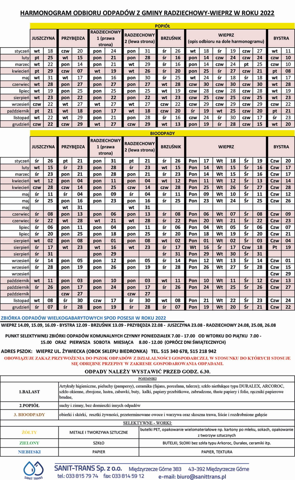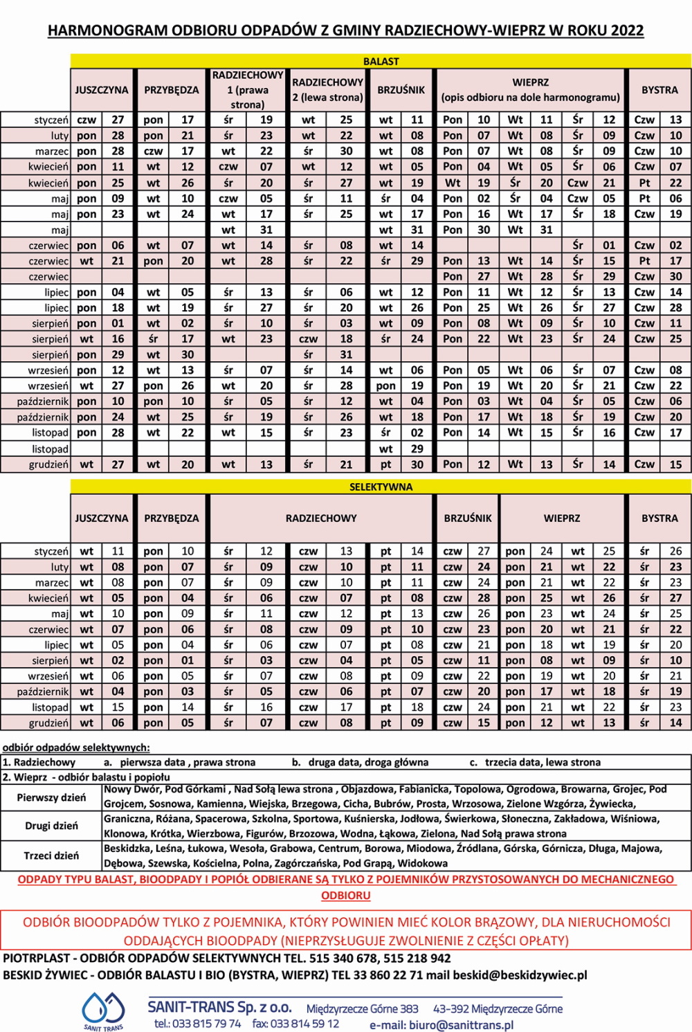Rada Gminy Radziechowy-Wieprz podjęła uchwałę nr XXXVIII/263/21 z dnia 14 grudnia 2021r. Ustalono stawkę opłaty za gospodarowanie odpadami komunalnymi z nieruchomości, na której zamieszkują mieszkańcy w wysokości 35 zł miesięcznie od mieszkańca. W tej opłacie odbierane będą zgodnie z harmonogramem spod posesji: balast, popiół, odpady segregowane oraz bioodpady, do których zaliczamy m.in. obierki i skórki, resztki żywności, przeterminowane owoce i warzywa oraz skoszona trawa, liście i rozdrobnione gałęzie.