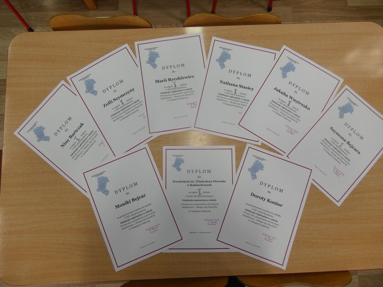 Sprawozdanie z realizacji projektu wraz z video blogiem zostały wysoko ocenione przez Wojewódzką Komisję Konkursową, czego efektem jest zakwalifikowanie Przedszkola im. Władysława Pieronka w Radziechowach do finału konkursu. Grupa przedszkolaków pod kierunkiem wychowawczyń 7 czerwca 2022r. wzięła udział w finale konkursu w siedzibie Zespołu Pieśni i Tańca "Śląsk" im. Stanisława Hadyny w Koszęcinie. Zaprezentowana przez przedszkolaki piosenka promująca Radziechowy, scenka o tematyce ekologicznej oraz rozwiązanie zadań przyrodniczych zostało bardzo wysoko ocenione przez komisję wojewódzką. W finale XII edycji konkursu „Edukacja regionalna w szkole” Przedszkole im. Władysława Pieronka w Radziechowach zajęło zaszczytne II miejsce.