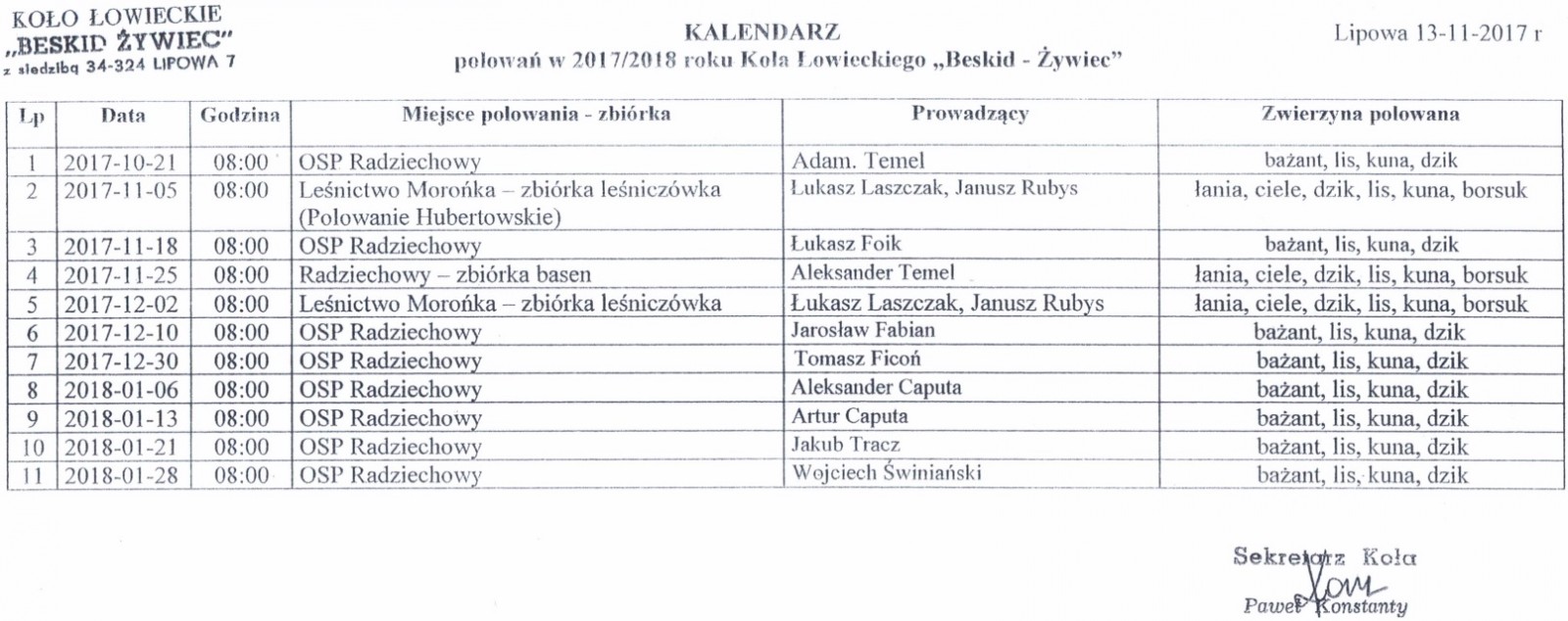 Informacja Koła Łowieckiego ''Beskid - Żywiec'' Dodano: 26.10.2017 r. Kategoria: Informacje ogólne Zarząd koła łowieckiego "Beskid - Żywiec" w Lipowej przesyła harmonogram polowań zbiorowych na sezon łowiecki 2017/2018.