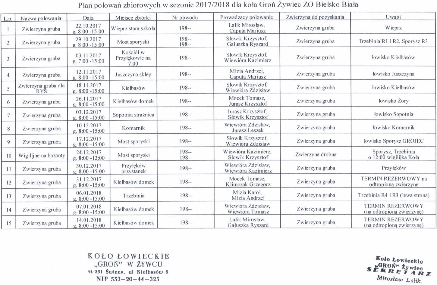 Informacja Koła Łowieckiego Groń Dodano: 09.10.2017 r. Kategoria: Informacje ogólne Zarząd koła łowieckiego Groń w Żywcu przesyła harmonogram polowań zbiorowych na sezon łowiecki 2017/2018.