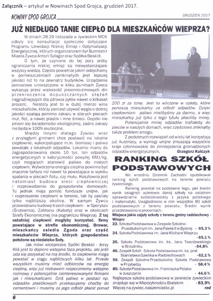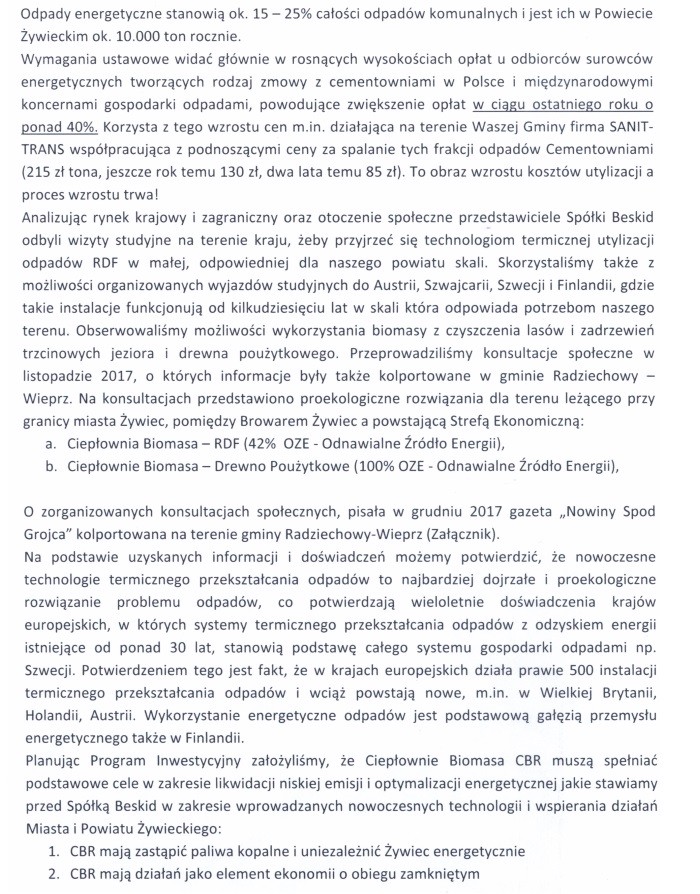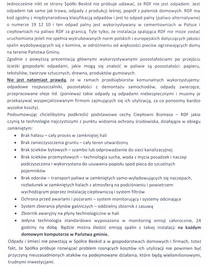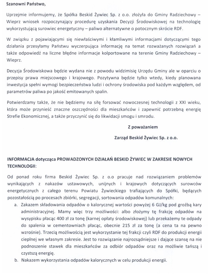 Uprzejmie informujemy, że Spółka Beskid Żywiec Sp. z o.o. złożyła do Gminy Radziechowy-Wieprz wniosek rozpoczynający procedurę uzyskania Decyzji Środowiskowej na technologię wykorzystującą surowiec energetyczny - paliwo alternatywne o potocznym skrócie RDF.