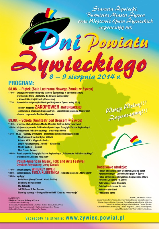 Tegoroczne Dni Powiatu Żywieckiego zostaną uświetnione festiwalem pn. Polish-American Music, Folk and Arts Festival. W czasie festiwalu wystąpią: Whiskey River, KoGo Blues (Jerzy Kossek i Marek Gorlitz), Bogusław Bierwiaczonek, The Taborets, Jeff Shiffman & Box Canyon oraz Grzegorz Heromiński jako “Kingsajz reaktywacja” (Stand-up comedy). Festiwal poprzedzony będzie koncertem popularnej grupy Tekla Klebetnica- finalisty programu „Mam Talent”.