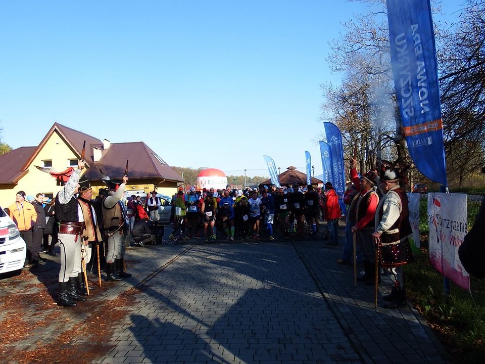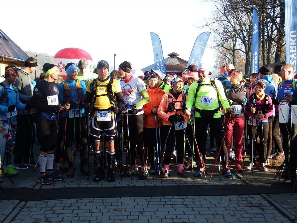 Piękna słoneczna pogoda towarzyszyła zawodnikom już od samego rana. Biuro zawodów rozpoczęło pracę o godzinie 6:00, bo pierwszy start zaplanowano na godzinę 8:00. Od samego świtu gwarno było już w całych Radziechowach, najpierw pakiety startowe z chipami, potem przestawianie samochodów bliżej mety, aby zrobić miejsce do odbioru pozostałym zawodnikom. Po krótkim przemówieniu wójt Maciej Mika zaczął odliczanie. Zanim Komandor się zorientował, Beskidzcy Harnasie odpalili już sygnał startowy i zawodnicy III Międzynarodowych Mistrzostw Polski w Maratonie Górskim Nordic Walking, oraz II Ogólnopolskiej Ligi Mistrzów Nordic Walking "GOLGOTA BESKIDÓW" ruszyli. Sponsorem tych zawodów był Hotel Zacisze z Ciśca. Ten barwny peleton kijkarzy w sile prawie 200 zawodników mknął do przodu pilotowany przez Janusza Sobkowskiego. Dwie godziny później - jak to przedstawił Komandor Edward Dudek - planowany był start ostatniego już Maratonu Beskidy. Po krótkim przywitaniu gości i zawodników oraz modlitwie prowadzonej przez dwóch księży maratończyków, nastąpiło odliczanie i Wójt Gminy na strzał z pukawek dał znak do startu. Zadowy zaczynały się na stadionie GKS Radziechowy – Wieprz. Następny ważny etap trasy jest przy domu komandora. To tutaj na drugim kilometrze trasy znajduje się pierwszy punkt odżywczy, przy którym tradycyjnie rodzina Dudków z mamą Karoliną i naszym muzykiem Bogdanem dopingują maratończyków. Bogdan wygrywa skoczne melodie na trąbce nagradzane wielokrotnie brawami przez maratończyków, których dalej polne drogi prowadzą do Przybędzy, a potem z powrotem do Radziechów, do znajdującego się przy domu ludowym drugiego punktu żywieniowego. Następnie zawodnicy udają się do Twardorzeczki gdzie stołują się na trzecim punkcie odżywczym obsługiwanym przez wolontariuszy szkoły podstawowej. Od szkoły ruszają dalej w stronę Ostrego, gdzie na początku Doliny Zimnika na 12 km czeka na nich 4 punkt odżywczy. Dalej maratończycy biegną przepiękną Doliną Zimnika i odbijają chip na 15 km dokonując pomiaru czasu. Od tego momentu w Buczynie trasa zaczyna się coraz bardziej wznosić ku górze. Na 20,5 km tuż przed wejściem na szlak niebieski, znajduje się najbardziej rozpoznawalny punkt żywieniowy, a obsługuje go wspierany przez przyjaciół sam dyrektor Maratonu Beskidy (przed laty czołowy biegacz narciarski) Sebastian Dudek. Od lat chodzą legendy, że tak zaopatrzonego punktu nie ma nigdzie na świecie. Dalej zaczyna się najtrudniejszy odcinek trasy, prowadzący po ruchomych górskich kamieniach z domieszką śniegu aż pod szczyt Skrzycznego 1257 m n.p.m., gdzie znajdował się punkt kontrolny obsługiwany przez znanych międzynarodowych sędziów narciarskich Adama Cieślara i Jacka Suszkę. Teraz trasa prowadzi 10 km w dół przez Kościelec do Doliny Zimnika, gdzie trasy się łączą. Tu w dolinie na punkcie powrotnym na maratończyków czekali Harnasie Beskidzcy, którzy głośno dopingowali zawodników, a i niejednokrotnie stawali z nimi do zrobienia pamiątkowej fotografii. Sporo niespodzianek czekało jeszcze na tych, którzy po raz pierwszy biegli tą trasą. Najpierw podejście pod Ostre (32 km trasy), następnie pod wapiennik w Radziechowach, potem zbieg obok cmentarza od punktu kontrolnego przy ośrodku zdrowia. Dalej trasa prowadzi na Golgotę Beskidów – wymagający dwukilometrowy odcinek prawdziwej wspinaczki pośród fantastycznie ułożonych stacji Drogi Krzyżowej. Tu na punkcie przemili ludzie Danusia i Stasiu z wnuczką Klaudią Maultz czekali na zawodników z gorąca herbatka i innymi smakołykami. Tradycyjnie nie zabrakło wspaniałych słodkich bułek. Potem tylko zdobycie szczytu Matyski i już z górki na pazurki, czy jak kto woli: zjazd, balet, ślizg po błotnistej mazi. Mało kto potrafił ustać na tej trasie, ale jak podkreślali na mecie ubłoceni po szyję biegacze i nordicowcy, przyjmując gratulacje od szefa, Irenki, czy Weroniki, „zjazd z Matyski to wisienka na torcie tego maratonu”. To tyle o trasie. Na mecie obok domu ludowego spiker Zenon Nowakowski zagrzewał do gorącego dopingu i zapraszał na zawody w Mini Runballu (to nowa ciekawa konkurencja w postaci chodu lub biegu w kuli). Wśród kibiców byli już na mecie zawodnicy z Rajdu Nordic Walking. Pięknie i głośno z trąbkami kibicowała Ilona i Henio Huzarewicz z ekipą Cidry Lotajom z Radzionkowa. Jako pierwszy na mecie pojawił się ubiegłoroczny Mistrz Polski Nordic Walking Marcin Michalec z Krosna z nowym rekordem trasy (4:49;11) zgarniając główną nagrodę - metrową kiełbasę, voucher na super weekend w Hotelu Zacisze i puchar Poseł Małgorzaty Pępek. Jako drugi zawodnik dotarł z kijami w ramach Mistrzostw Polski Górskich NW Karol Stiller Częstochowa 5:03;55 i trzeci zawodnik tej grupy Piotr Niechwiejczyk Świętochłowice 5:04;51.