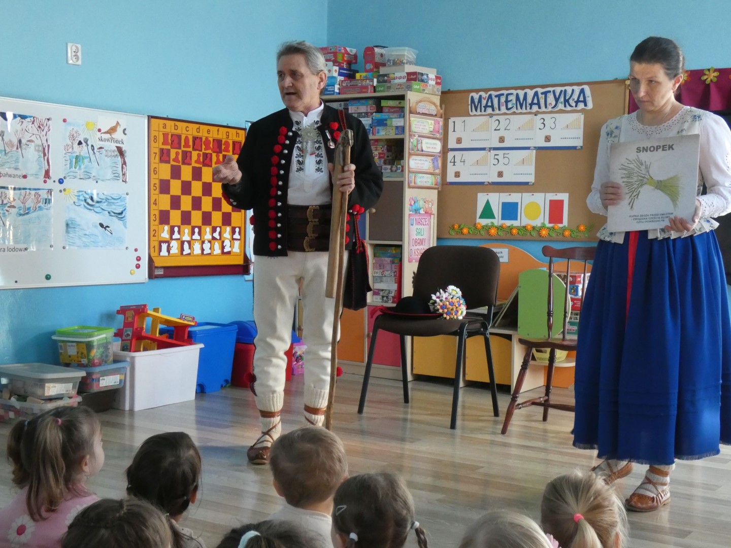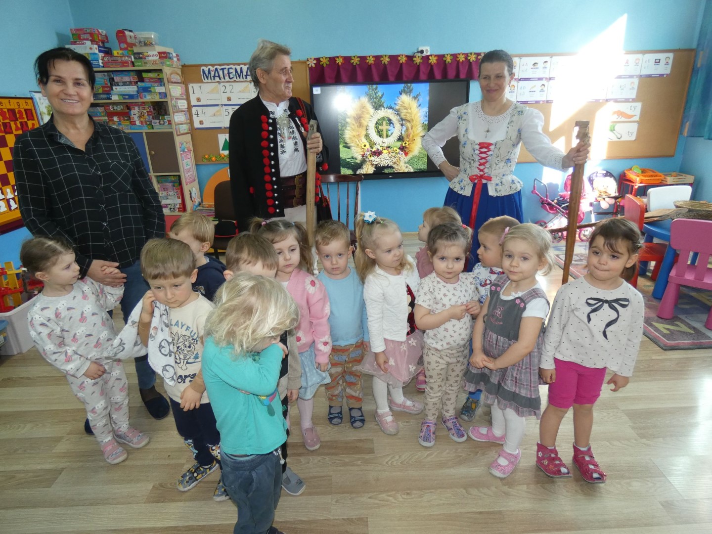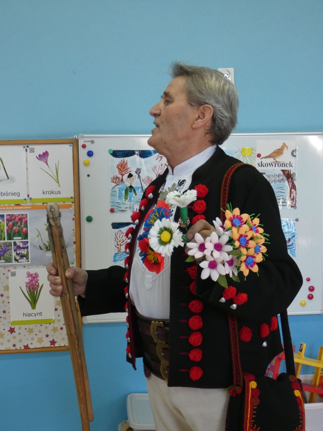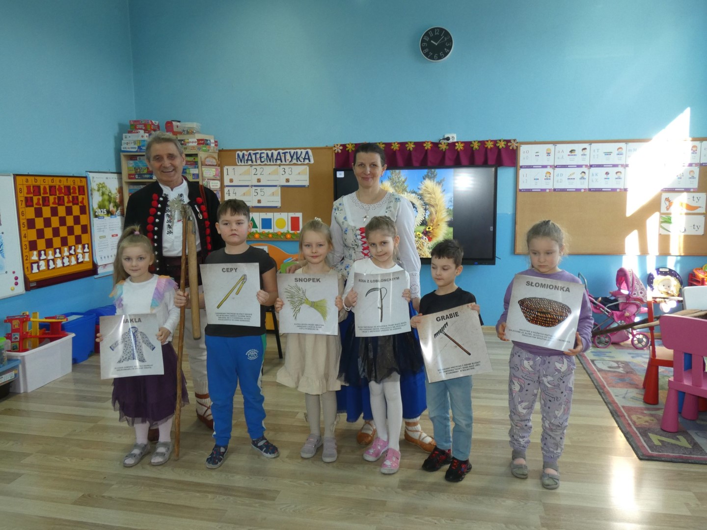 Dzieci wysłuchały opowieści w pięknej góralskiej gwarze o pracy rolników towarzyszącej drodze od zasiania ziarna aż do upieczenia bochenka chleba. Opisane zostały zwyczaje ludowe i obrzędy związane z dbałością o dobre plony, które tej ciężkiej pracy towarzyszą praktycznie cały rok. Zwieńczeniem tych wszystkich starań była wspólna radość i świętowanie w postaci dożynek. Oboje regionaliści podkreślali znaczenie wzajemnej pomocy i współpracy między mieszkańcami wsi. Jakimi narzędziami uprawiano pole i jakie zmiany następowały przez lata? Które obrzędy już zamarły, a z jakimi możemy spotkać się jeszcze dzisiaj? Które z nich przypomniano całkiem niedawno? Serdecznie dziękujemy za przewodnictwo w odnajdywaniu odpowiedzi na te wszystkie pytania, za niezwykle wartościowe warsztaty regionalne i serce, które nasi lokalni twórcy ludowi wkładają w pielęgnowanie tradycji góralskich. Spotkanie zakończyła pani Brygida Murańska recytacją wiersza własnego autorstwa „Kiela zrobij trzeba, by miej konsek chleba”, którego treść obrazuje całoroczny gospodarski trud zmierzający do wyżywienia rodziny:
