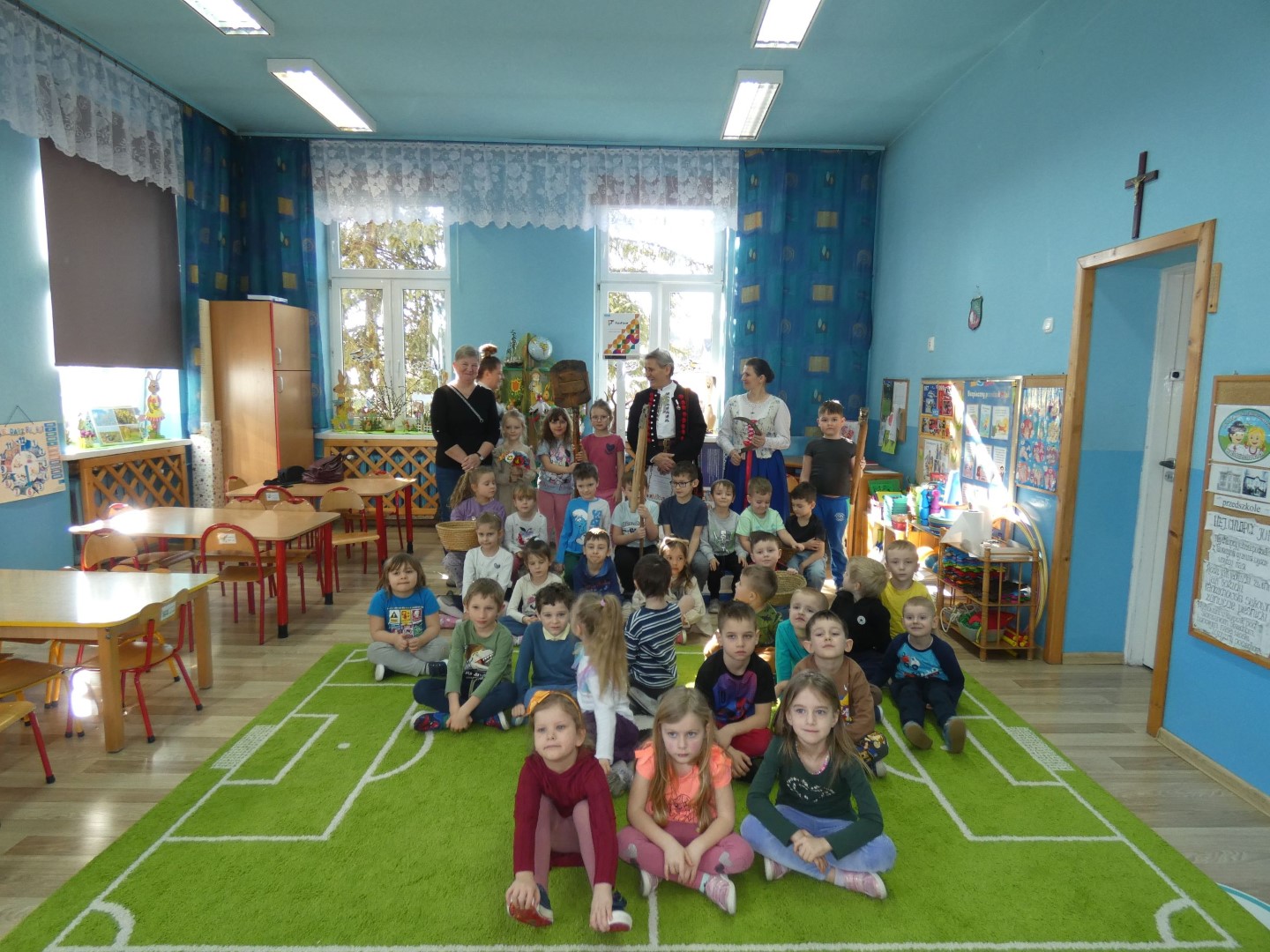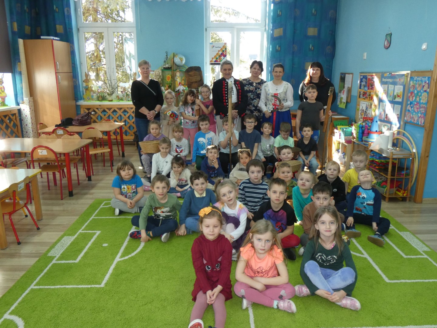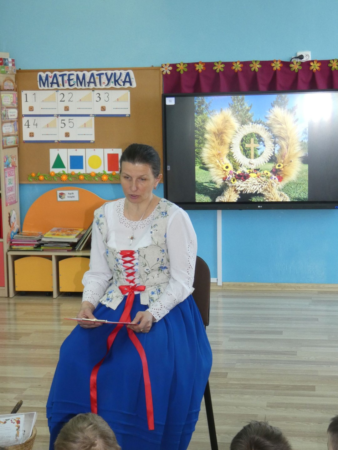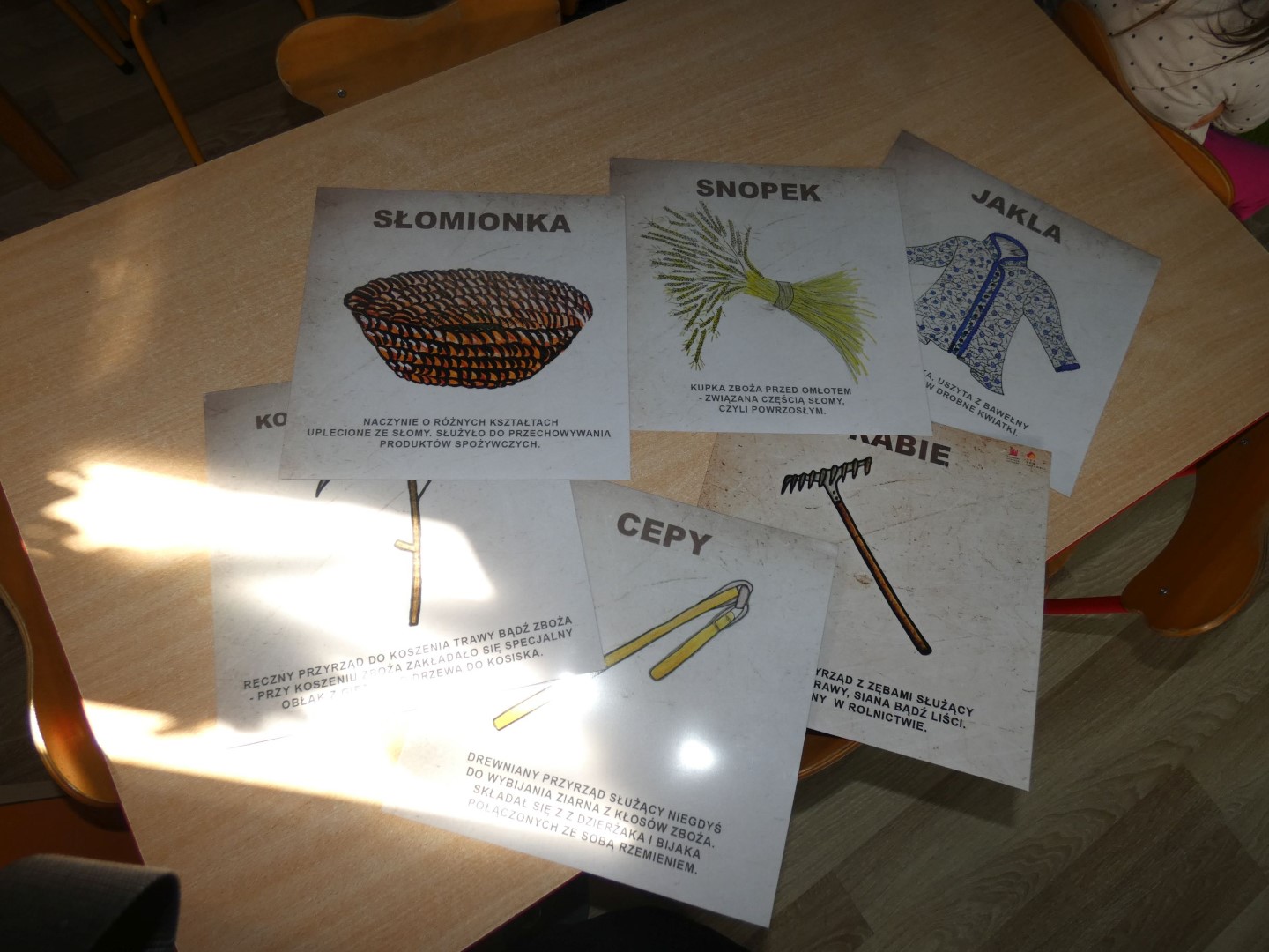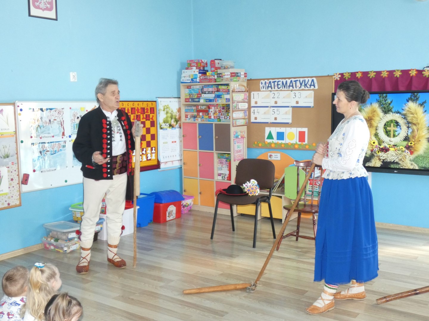 Dzieci wysłuchały opowieści w pięknej góralskiej gwarze o pracy rolników towarzyszącej drodze od zasiania ziarna aż do upieczenia bochenka chleba. Opisane zostały zwyczaje ludowe i obrzędy związane z dbałością o dobre plony, które tej ciężkiej pracy towarzyszą praktycznie cały rok. Zwieńczeniem tych wszystkich starań była wspólna radość i świętowanie w postaci dożynek. Oboje regionaliści podkreślali znaczenie wzajemnej pomocy i współpracy między mieszkańcami wsi. Jakimi narzędziami uprawiano pole i jakie zmiany następowały przez lata? Które obrzędy już zamarły, a z jakimi możemy spotkać się jeszcze dzisiaj? Które z nich przypomniano całkiem niedawno? Serdecznie dziękujemy za przewodnictwo w odnajdywaniu odpowiedzi na te wszystkie pytania, za niezwykle wartościowe warsztaty regionalne i serce, które nasi lokalni twórcy ludowi wkładają w pielęgnowanie tradycji góralskich. Spotkanie zakończyła pani Brygida Murańska recytacją wiersza własnego autorstwa „Kiela zrobij trzeba, by miej konsek chleba”, którego treść obrazuje całoroczny gospodarski trud zmierzający do wyżywienia rodziny:
