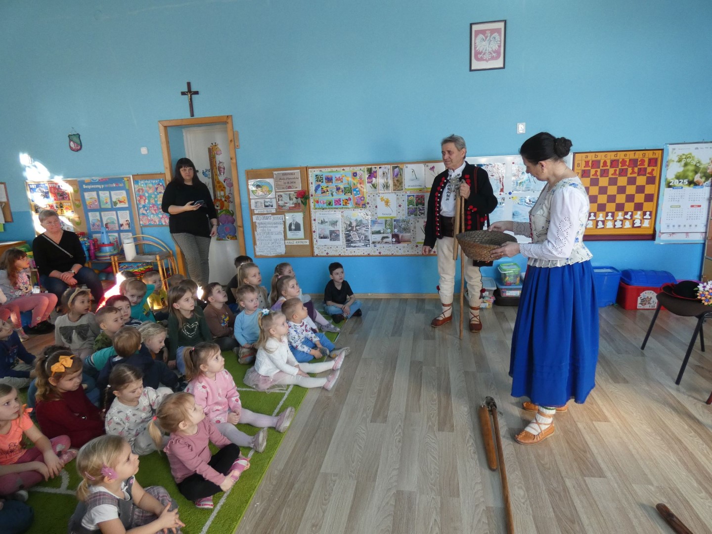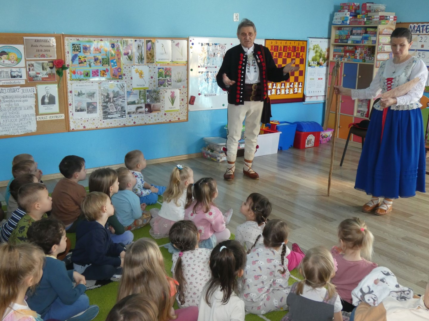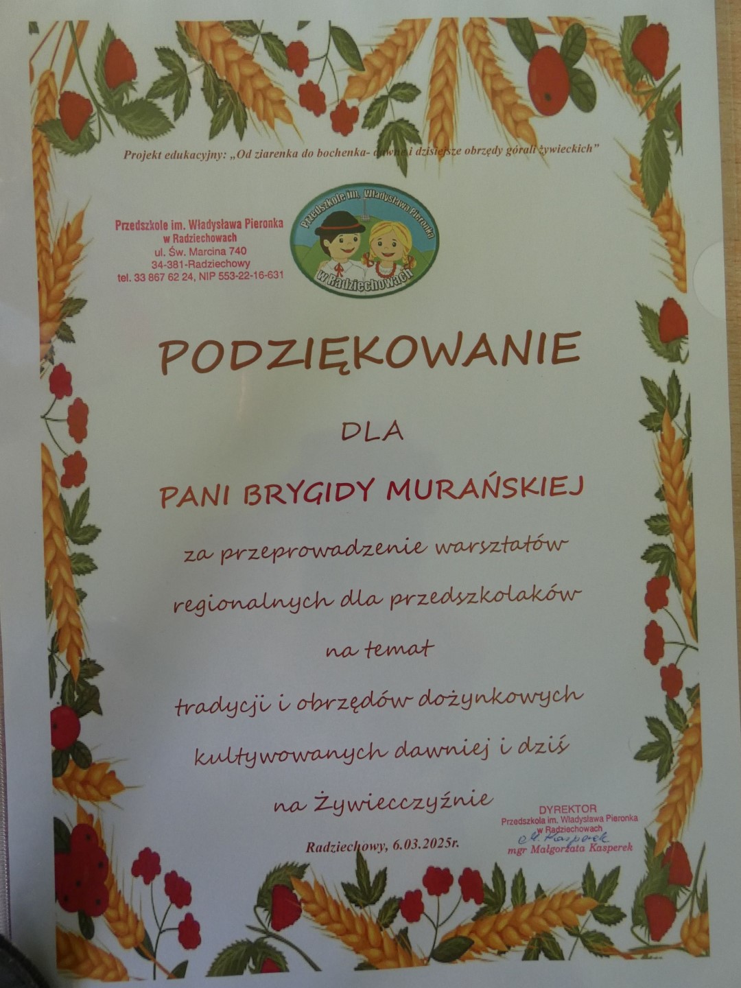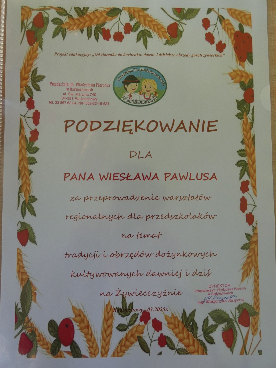 Przedszkole im. Władysława Pieronka w Radziechowach od wielu lat realizuje edukacyjne projekty regionalne, których celem jest promocja tradycji górali żywieckich. Tegoroczny projekt nosi nazwę „Kiela zrobij trzeba, by miej konsek chleba - dawne i dzisiejsze obrzędy dożynkowe górali żywieckich”. Wychowankowie przedszkola pod kierunkiem nauczycielek zajmą się badaniem tradycji związanych z ciężką pracą rolnika, zmierzającą do uzyskania plonów, której zwieńczeniem jest święto plonów, czyli dożynki. Jak obrzędy dożynkowe zmieniały się na przestrzeni wieków? Poszukiwanie odpowiedzi na te pytania rozpoczęliśmy od spotkania z ludźmi dla których ludowe tradycje górali żywieckich nie mają żadnych tajemnic. W dniu 6 marca 2025r. Przedszkole im. Władysława Pieronka w Radziechowach odwiedzili twórcy ludowi i regionaliści: Brygida Murańska i Wiesław Pawlus. Pani Brygida od lat współpracuje z przedszkolem wspierając realizację projektów regionalnych jako poetka ludowa, gawędziarka, instrumentalistka i choreograf. Pan Wiesław Pawlus – gawędziarz, twórca ludowy zajmujący się bibułkarstwem i haftem artystycznym, również nie pierwszy raz spotkał się z radziechowskimi przedszkolakami. Oboje są bardzo znanymi na Żywiecczyźnie regionalistami, uhonorowanymi wieloma nagrodami i tytułami przez instytucje zajmujące się kulturą.