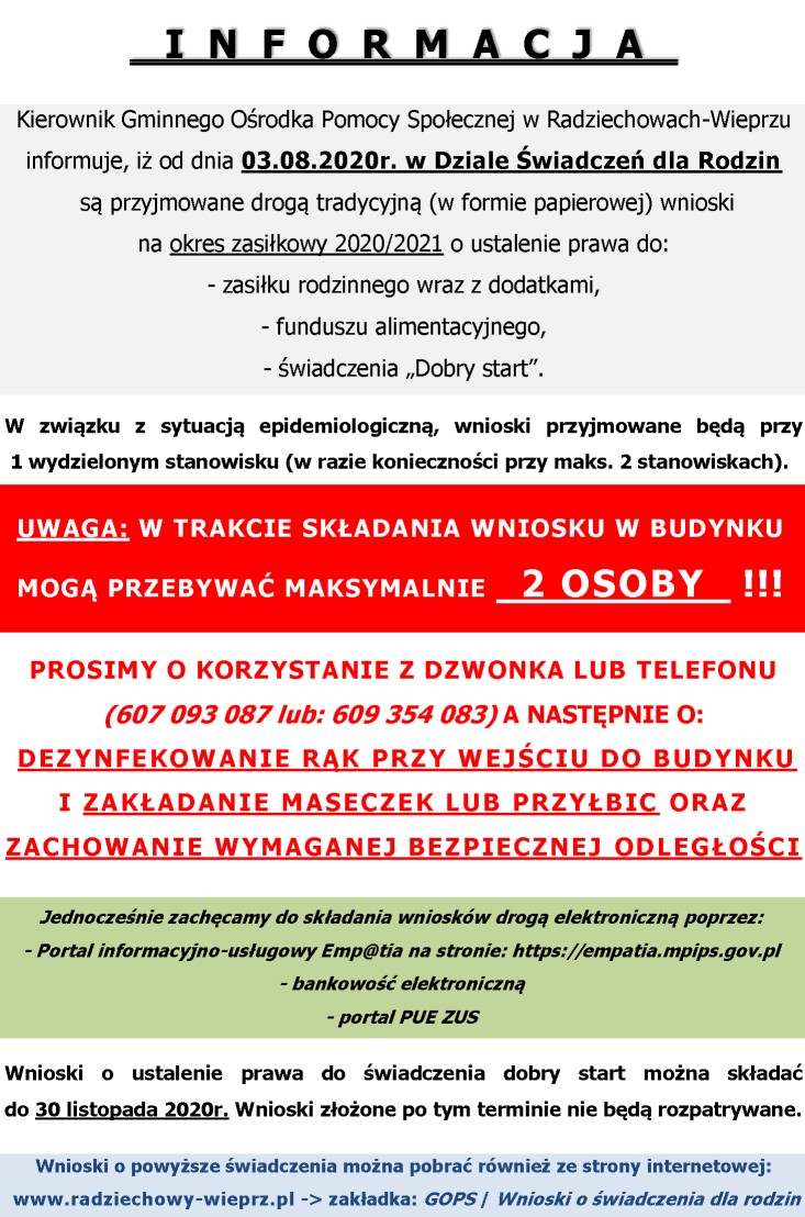 od dnia 03.08.2020r. w Dziale Świadczeń dla Rodzin są przyjmowane drogą tradycyjną (w formie papierowej) wnioski na okres zasiłkowy 2020/2021 o ustalenie prawa do: