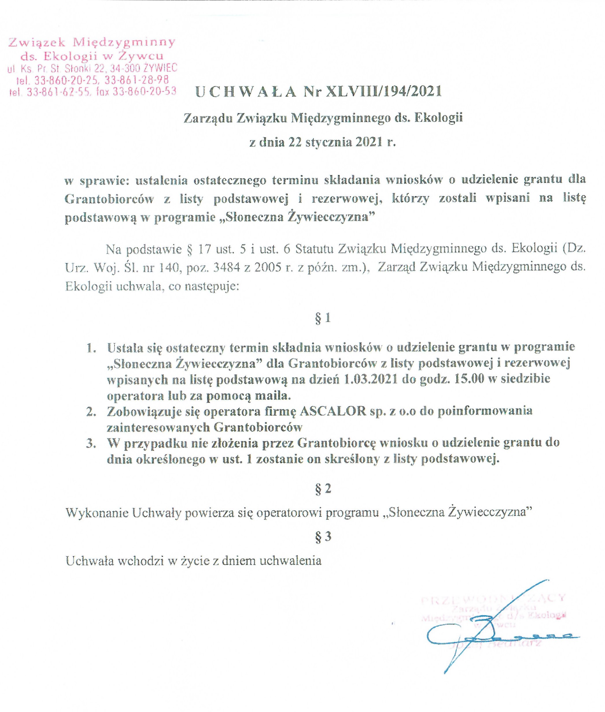 Załącznik – Uchwała Zarządu Związku w sprawie ustalenia ostatecznego terminu składania wniosków