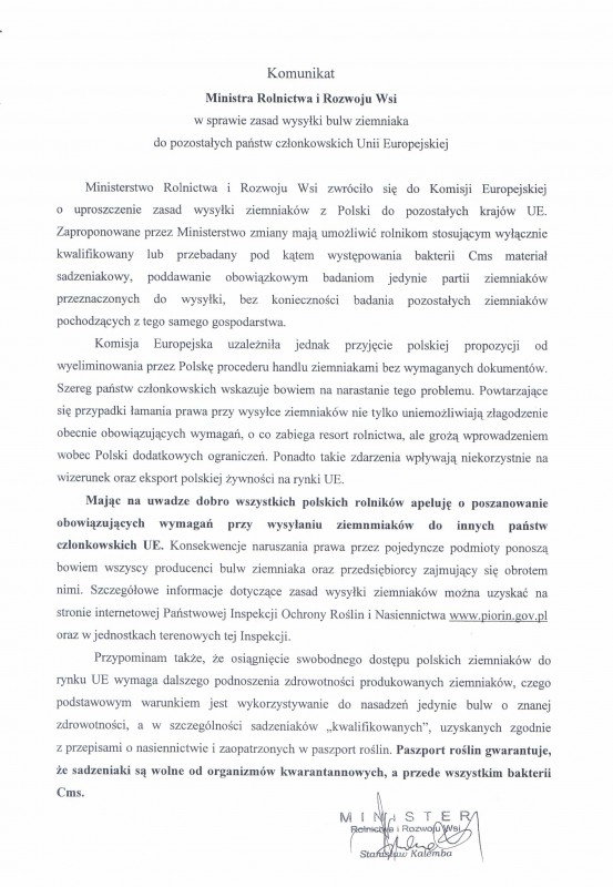 Mając na uwadze dobro wszystkich polskich rolników apeluję o poszanowanie obowiązujących wymagań przy wysyłaniu ziemniaków do innych państw członkowskich UE. Konsekwencje naruszania prawa przez pojedyncze podmioty ponoszą bowiem wszyscy producenci bulw ziemniaka oraz przedsiębiorcy zajmujący się obrotem nimi. Szczegółowe informacje dotyczące zasad wysyłki ziemniaków można uzyskać na stronie internetowej Państwowej Inspekcji Ochrony Roślin i Nasiennictwa www.piorin.gov.pl oraz w jednostkach terenowych tej Inspekcji.