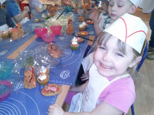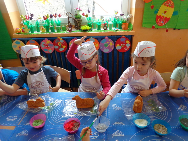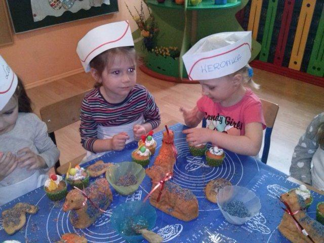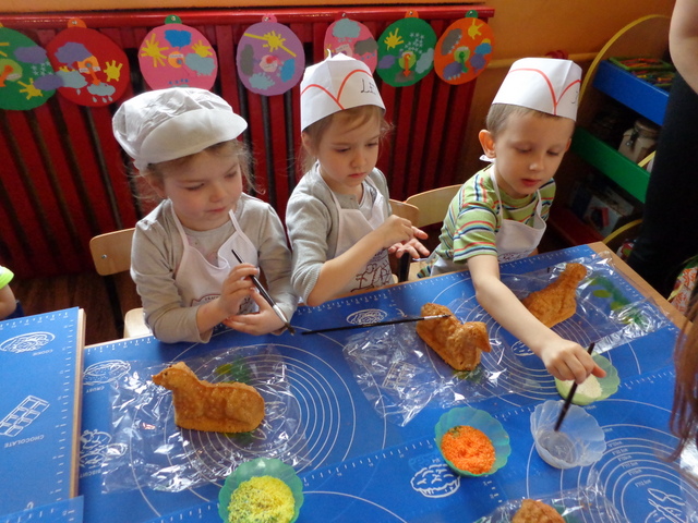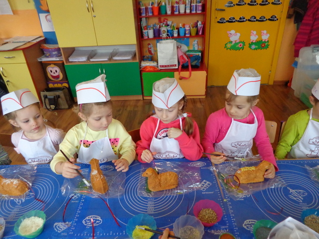 Wielkanoc to dla bardzo wielu osób najważniejsze święto w całym roku. Kojarzy się nam z pisankami, baziami, barankiem i stołem suto zastawionym mazurkami, babami wielkanocnymi jajkami, mięsami i mnóstwem innych pyszności. Dodatkowo wiąże się z początkiem wiosny - zielonej, radosnej i słonecznej. W wielu domach przygotowania rozpoczynają się już na kilka dni przed Wielkanocą. Stąd pomysł by w naszym przedszkolu dzieci zobaczyły, jak to jest wcielić się w role małego kucharza. 31 marca we wszystkich oddziałach przedszkola odbyły się wspaniałe warsztaty cukiernicze, które prowadziły pracownice Cukierni GAŁUSZKA. Celem warsztatów było wzbogacenie wiedzy dzieci na temat zdrowego odżywiania się, wielozmysłowe poznanie wybranych przypraw i dodatków stosowanych w cukiernictwie. Dzieci otrzymały czapki kucharskie oraz fartuszki, dzięki czemu nie tylko świetnie się prezentowały, ale przede wszystkim poczuły się jak pracownicy prawdziwej kuchni. Z niewielką pomocą personelu przedszkola dekorowały biszkoptowego baranka, przygotowały babeczki oraz mazurki wielkanocne. Miało być smacznie i kolorowo i na pewno się udało, ponieważ wszystkie dzieci były zachwycone. Z ogromnym zaangażowaniem brały udział w tak atrakcyjnych zajęciach, zwłaszcza że miały możliwość smakowania, dotykania i samodzielnego działania. Nasi mali cukiernicy zostali na koniec zajęć obdarowani pięknym kartonem do którego pakowali swoje wypieki.
