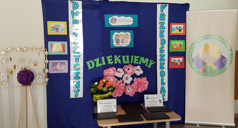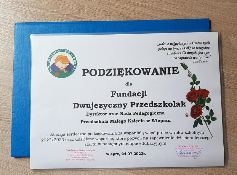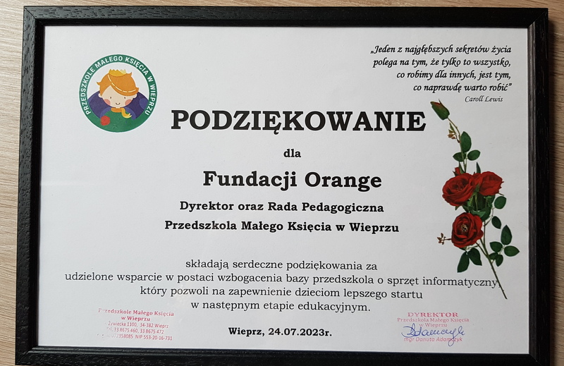 W imieniu wszystkich nauczycieli zatrudnionych w Przedszkolu Małego Księcia w Wieprzu oraz własnym składam serdeczne podziękowania Fundacji Orange za pozytywną odpowiedź na naszą prośbę i podarowanie nam laptopów oraz Fundacji Dwujęzyczny Przedszkolak za udzielane nam wsparcie w zakresie wzbogacania naszej bazy dydaktycznej i tym samym stwarzanie coraz lepszych warunków edukacyjnych, wychowawczych i opiekuńczych w naszym przedszkolu.