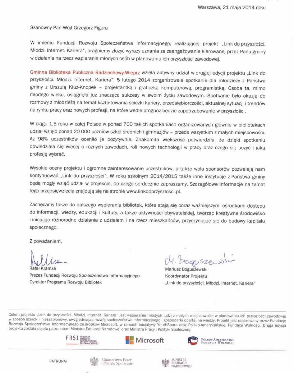 W imieniu Fundacji Rozwoju Społeczeństwa Informacyjnego, realizującej projekt „Link do przyszłości. Młodzi. Internet. Kariera", pragniemy złożyć wyrazy uznania za zaangażowanie kierowanej przez Pana gminy w działania na rzecz wspierania młodych osób w planowaniu ich przyszłości zawodowej.