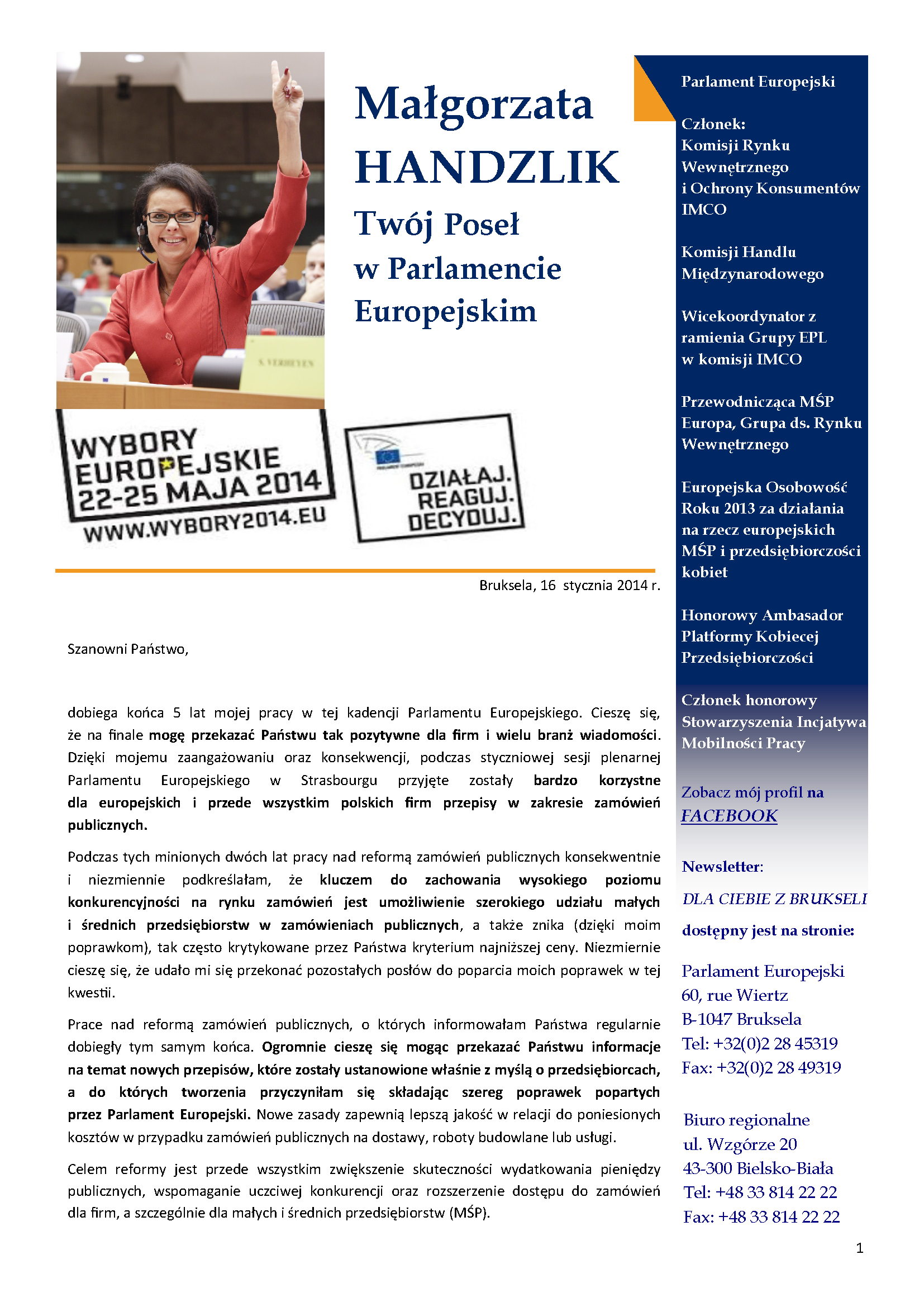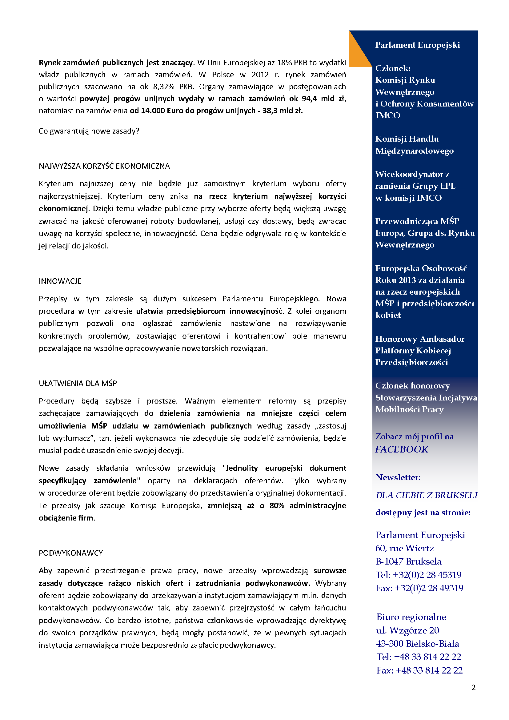 dobiega końca 5 lat mojej pracy w tej kadencji Parlamentu Europejskiego. Cieszę się, że na finale mogę przekazać Państwu tak pozytywne dla firm i wielu branż wiadomości. Dzięki mojemu zaangażowaniu oraz konsekwencji, podczas styczniowej sesji plenarnej Parlamentu Europejskiego w Strasbourgu przyjęte zostały bardzo korzystne dla europejskich i przede wszystkim polskich firm przepisy w zakresie zamówieo publicznych.