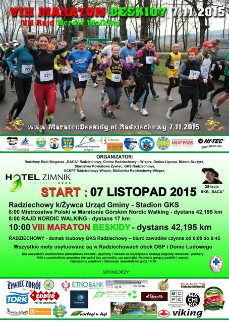 Po 21 latach od tamtego historycznego wydarzenia Radziechowy w tym roku znów są organizatorem po raz pierwszy w Polsce Mistrzostw Polski w Maratonie Górskim Nordic Walking. Dotychczas podczas Maratonu Beskidów bo taką obecnie nosi nazwę, zawody te na maratońskiej trasie rozgrywane były jako Rajd Nordic Walking na dystansie 42,195 km. W tym roku impreza rangi mistrzowskiej pod Patronatem Polskiego Stowarzyszenia Nordic Walking i Sponsora Hotel Zacisze z Ciśca. Na tej górskiej trasie z Radziechów przez Twardorzeczkę, Ostre, przepiękną Dolinę Zimnika, Skrzyczne 1257 m n.p.m. Kościelec i powrót tą samą trasą do Radziechów, następnie wspaniałą drogą Golgoty Beskidów ze szczytem Matyska 610 m n.p.m. i meta przy Domu Ludowym. Dla mniej zaawansowanych wytyczyliśmy krótsza trasę 17 km jednak przy jej wytyczaniu nie ominęliśmy najwspanialszego dzieła naszej gminy jakim jest unikatowa Droga Krzyżowa na Matyskę. Nad prawidłowa techniką marszu czuwać będą sędziowie PSNW, start ze stadionu GKS nastapi o godzinie 8:00 wspólnie dla obu tych grup. Biuro zawodów będzie czynne w domku klubowym GKS od godziny 6:00. Natomiast start już rozgrywanego po raz VIII Maratonu Beskidy nastąpi punktualnie o godzinie 10:00. Aktualnie na listach startowych mamy zgłoszenia z 8 państw, nawet tak odległych jak Canada, wśród których mamy mistrzów świata i Europy, w Radziechowach nie zabraknie też znanych w całej Europie Spartathloczyków ( marzenie każdego ultrasa bieg z Aten do Sparty 246 km, który jako pierwszy Polak pokonał w 1995 roku Radziechowianin Edward Dudek i to na wspaniałym czwartym miejscu). Start tych imprez w Radziechowach obok Urzędu Gminy ze stadionu GKS 7 listopada 2015 r. Na listach startowych mamy ponad 500 uczestników. Dla uczestników tego sportowego święta przygotowaliśmy piękne okolicznościowe medale , koszulki, dyplomy i pamiątki. A wszystkich naszych zawodników nakarmi szef kuchni Hotelu Zimnik. Tradycyjnie oprócz pucharów Zakłady Mięsne w Żywcu przygotowują ponad metrowe kiełbasy specjalnie produkowane na tą imprezę. A więc do zobaczenia na starcie i trasie tego wspaniałego wydarzenia, zawodników zapraszamy na start a kibiców i sympatyków o gorący doping.