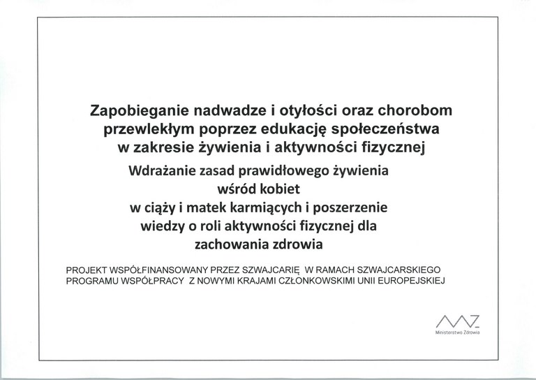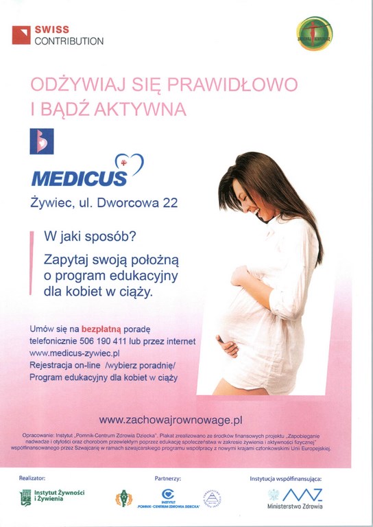 Uprzejmie informuję ,że Medicus Maurycy Jakubiec Urszula Jakubiec Spółka Jawna z siedzibą w Żywcu został wybrany Regionalnym Ośrodkiem Programu „Zapobieganie nadwadze i otyłości oraz chorobom przewlekłym poprzez edukację społeczeństwa w zakresie żywienia i aktywności fizycznej„ . Projekt ten jest całkowicie bezpłatny dla uczestniczących w nim kobiet w ciąży. Współfinansowany jest przez Szwajcarię w ramach Szwajcarskiego Programu współpracy z nowymi krajami członkowskimi Unii Europejskiej. W programie na terenie całego kraju zaplanowano udział 28 000 ciężarnych kobiet.