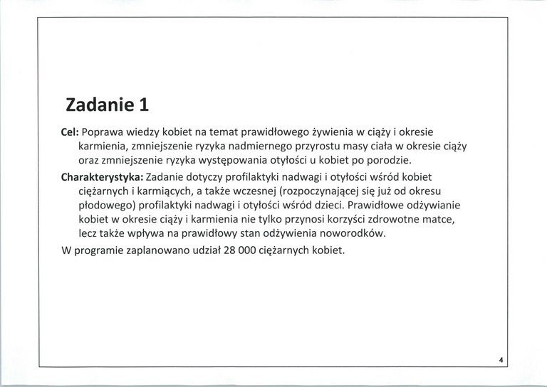W ramach Programu realizowane będą bezpłatne porady edukacyjne dla kobiet w ciąży z Zadania 1: „Wdrożenie zasad prawidłowego żywienia wśród kobiet w ciąży i matek karmiących i poszerzenie wiedzy o roli aktywności fizycznej dla zachowania zdrowia" .