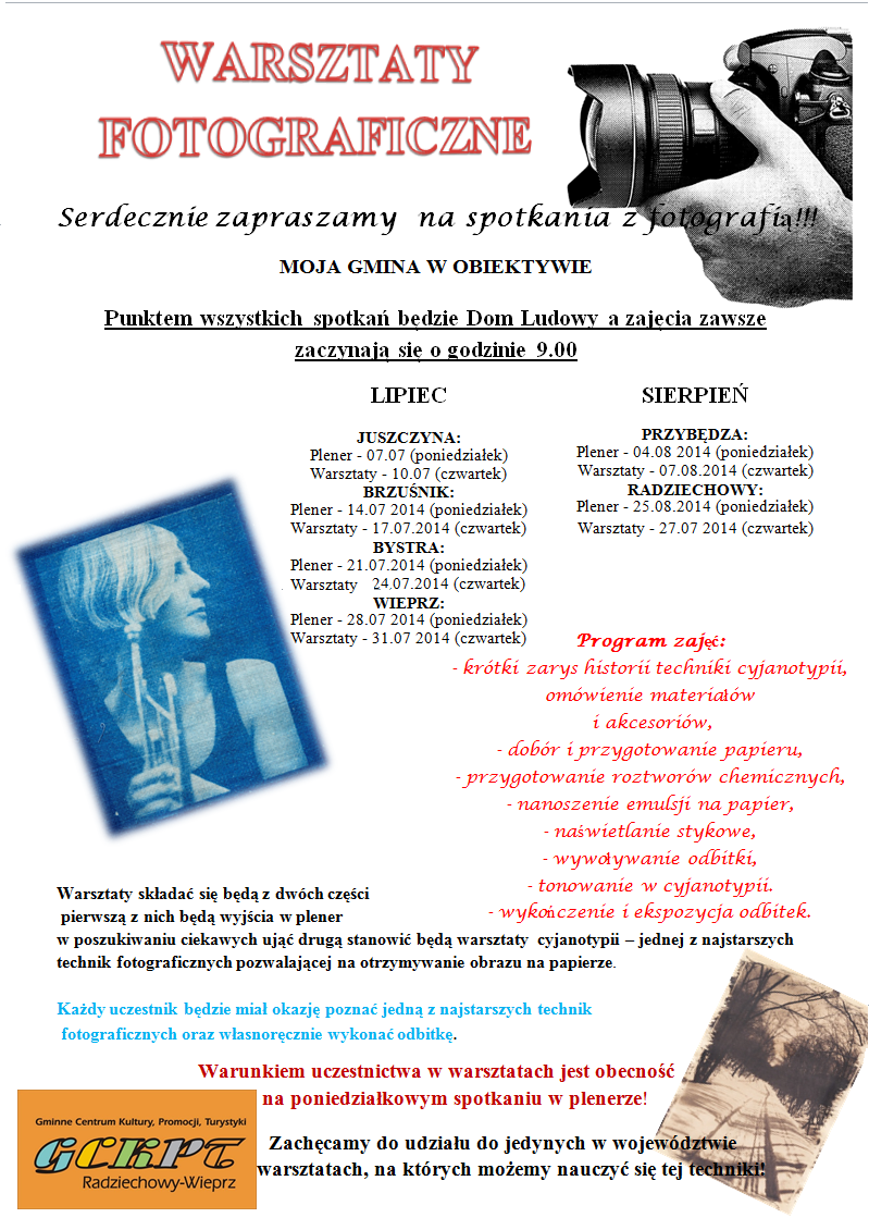 17.07.2014 (czwartek) MOJA GMINA W OBIEKTYWIE (warsztaty) Dom ludowy w Brzuśniku (godz. 9.00). Warsztaty fotograficzne oparte o technikę cyjanotypii.