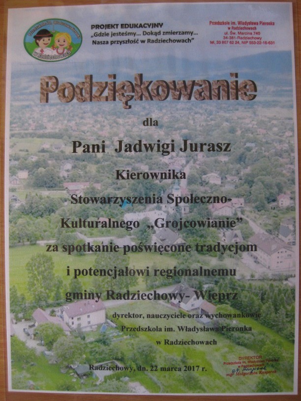 Pięknym podsumowaniem wydarzenia niech będą słowa hymnu przedszkola autorstwa Władysława Pieronka: „Hej, chłopcy juhasi podzieli sie kasik z Jaworzynki cy ze wsi, wyście wsytcy nasi. Rośli jak jedlicki, zwinni jak kozicki, radziychowski sykowne zanućcie pieśnicki”. Pieśń tę należy rozumieć jako apel do potomnych o zachowanie od zapomnienia góralskiej gwary i tradycji naszych przodków.