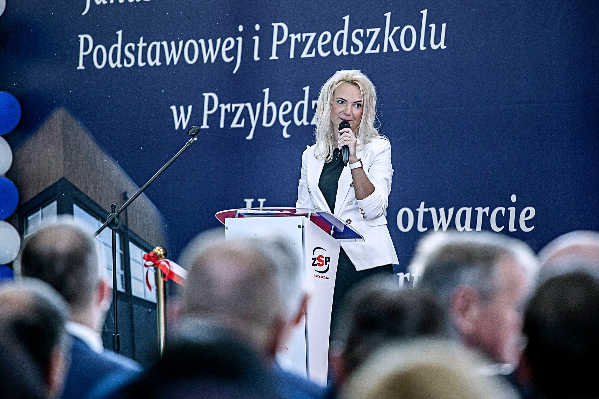 Po dotarciu do sali gimnastycznej, Dyrektor Zespołu Szkolno-Przedszkolnego w Przybędzy, Pani Alicja Wrona, przywitała wszystkich zaproszonych gości. Jej ciepłe słowa i serdeczność stanowiły znakomite wprowadzenie do dalszej części uroczystości.