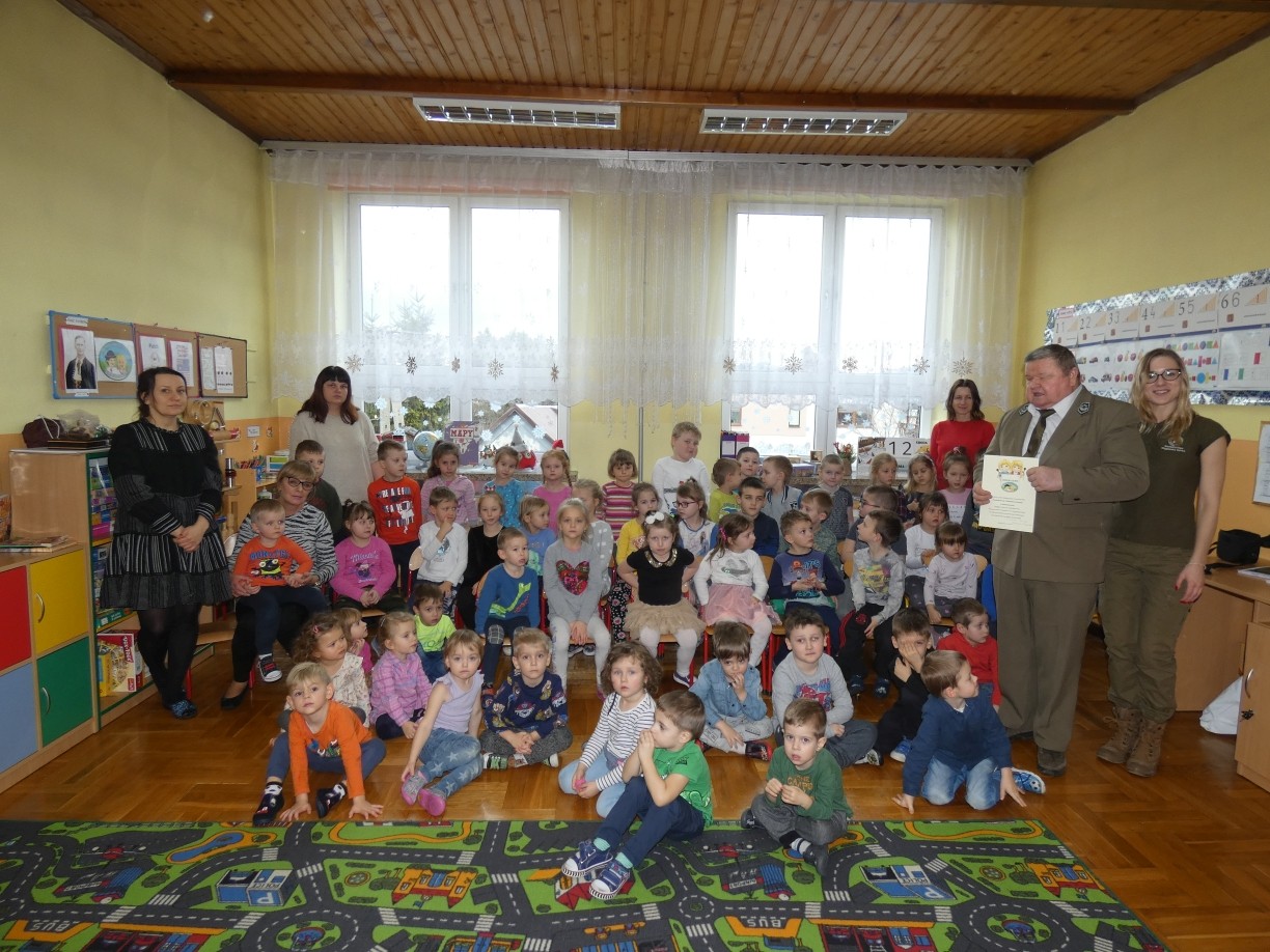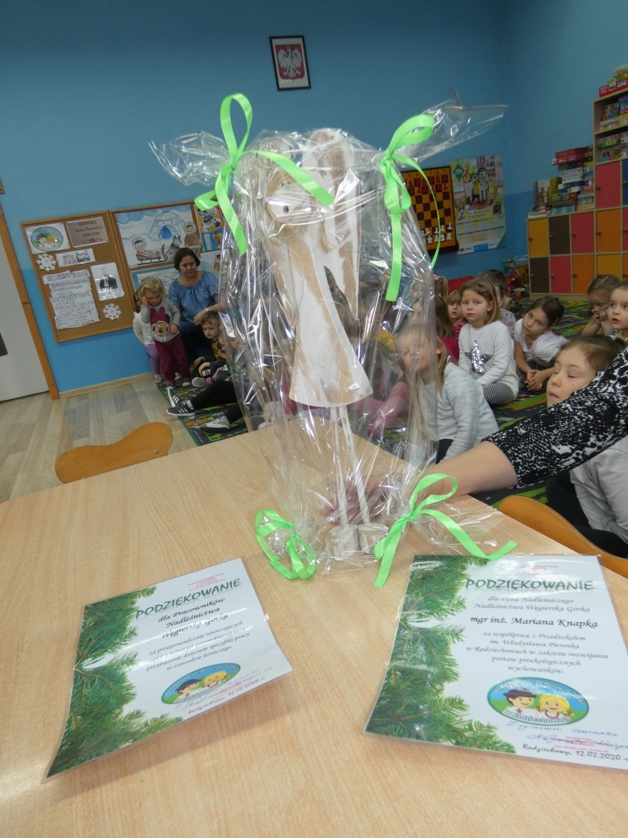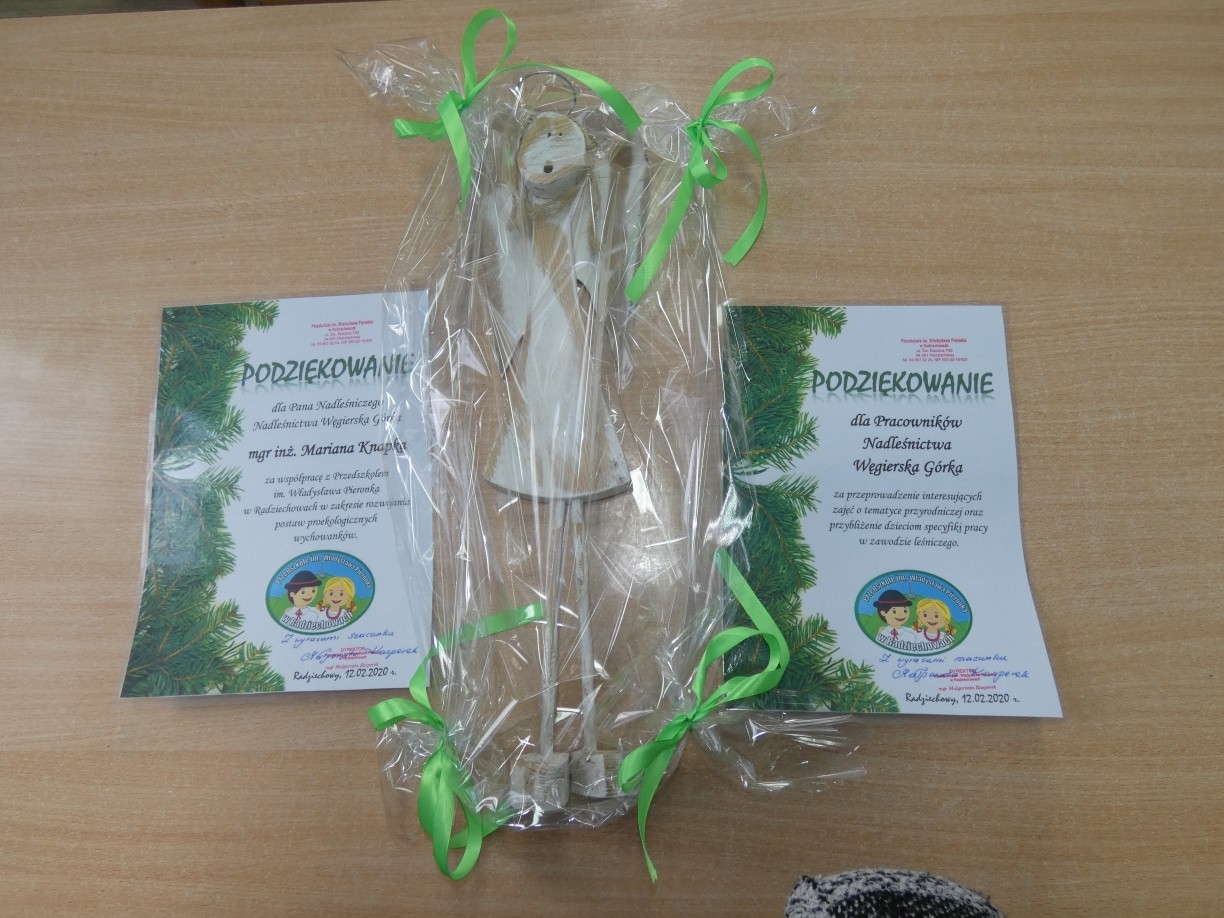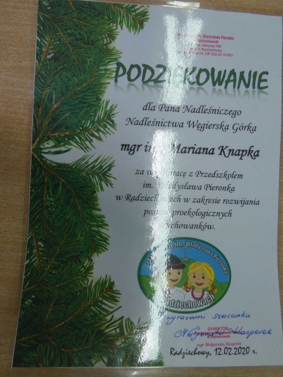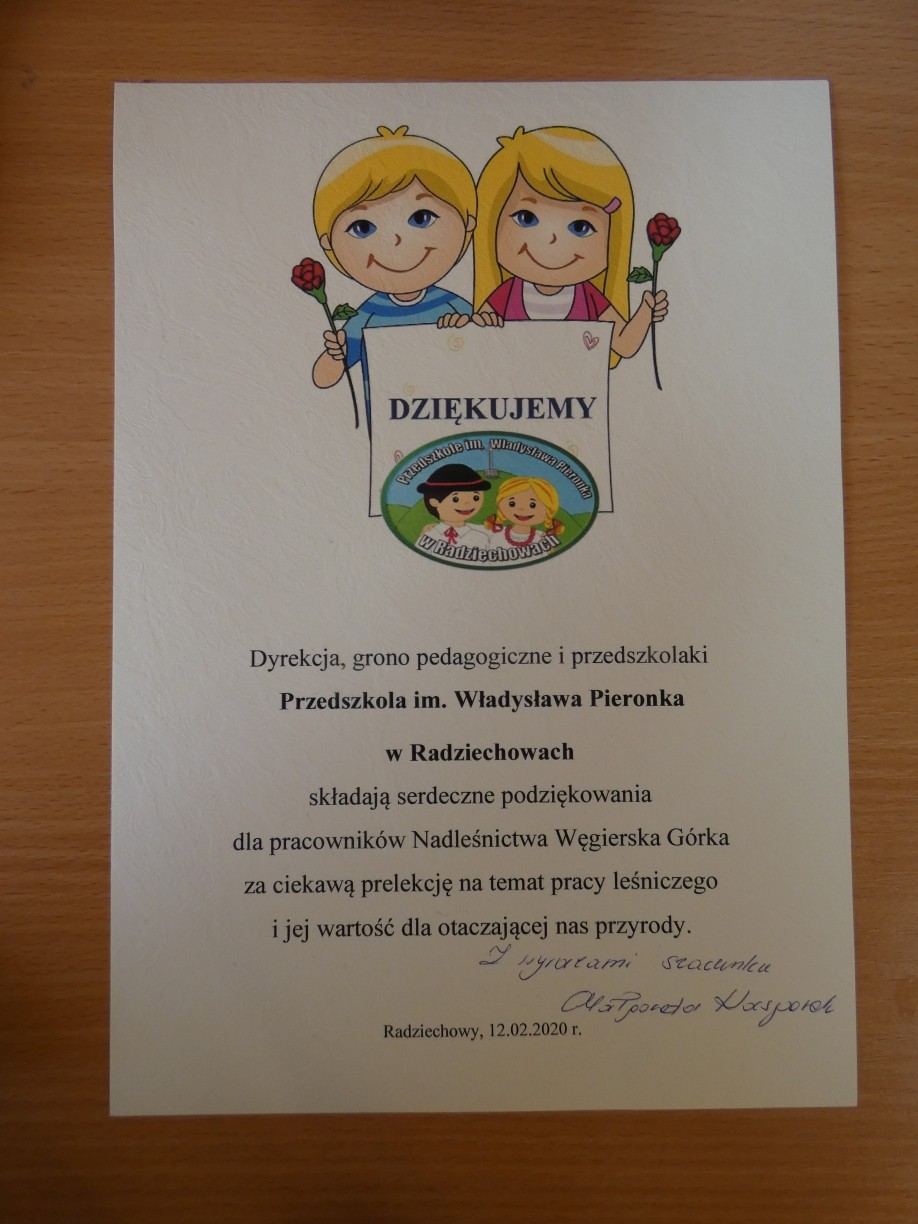 Nikogo nie trzeba przekonywać, jak ważne jest wychowanie młodego pokolenia w szacunku do przyrody i dbałości o środowisko naturalne. Wieloletnia współpraca Przedszkola im. Władysława Pieronka w Radziechowach z Nadleśnictwem Węgierska Górka jest w aspekcie wychowawczym i edukacyjnym nie do przecenienia. Wszyscy znamy niezwykle wartościowe coroczne konkursy plastyczne organizowane przez Nadleśnictwo, w których nasze przedszkolaki od wielu lat odnoszą sukcesy. Za każdym razem wracają do przedszkola obdarowani atrakcyjnymi nagrodami. Wielokrotnie odwiedzaliśmy Izbę Przyrodniczą w siedzibie Nadleśnictwa. Nasze przedszkolne korytarze niejednokrotnie ozdabiały podarowane przez Nadleśnictwo choinki, a piękna statuetka z wilkiem od Pana Nadleśniczego Mariana Knapka zajmuje honorowe miejsce w gabinecie dyrektora przedszkola. Równie cenną formą współpracy są cykliczne spotkania przedszkolaków z pracownikami Nadleśnictwa Węgierska Górka. Ostatnie takie spotkanie miało miejsce w obydwu naszych przedszkolach w dniu 12 lutego 2020r. Dzieci z ogromnym zainteresowaniem wysłuchały prelekcji na temat ptaków zamieszkujących nasze lasy i sposobach wspierania ich podczas zimy. Były też odpowiedzi na pytania dotyczące wielu innych aspektów pracy leśniczego. Pracownicy Nadleśnictwa przekazali na ręce dyrektor Małgorzaty Kasperek piękny album „Lasy Polskie” z dedykacją Pana Nadleśniczego Mariana Knapka: