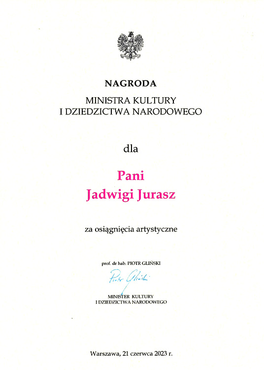 Serdecznie gratulujemy Jadwidze JURASZ, uhonorowanej w czerwcu tego roku indywidualną nagrodą Ministra Kultury i Dziedzictwa Narodowego za osiągnięcia artystyczne dla kultury i ochrony dziedzictwa kulturowego Beskidu Żywieckiego. Cieszymy się bardzo z wyróżnienia Pani Jadwigi, bo jej działalność na rzecz naszego Stowarzyszenia, a co za tym idzie DZR „Mali Grojcowianie” i ZR „Grojcowianie” z Wieprza zasługuje na najwyższe oceny i niech będzie inspiracją dla kolejnych instruktorów i działaczy kultury. Nagroda została przyznana przez Ministra Prof. Piotra Glińskiego na wniosek Regionalnego Ośrodka Kultury w Bielsku Białej. Okazją był też zbliżający się Jubileuszowy 60. Tydzień Kultury Beskidzkiej.