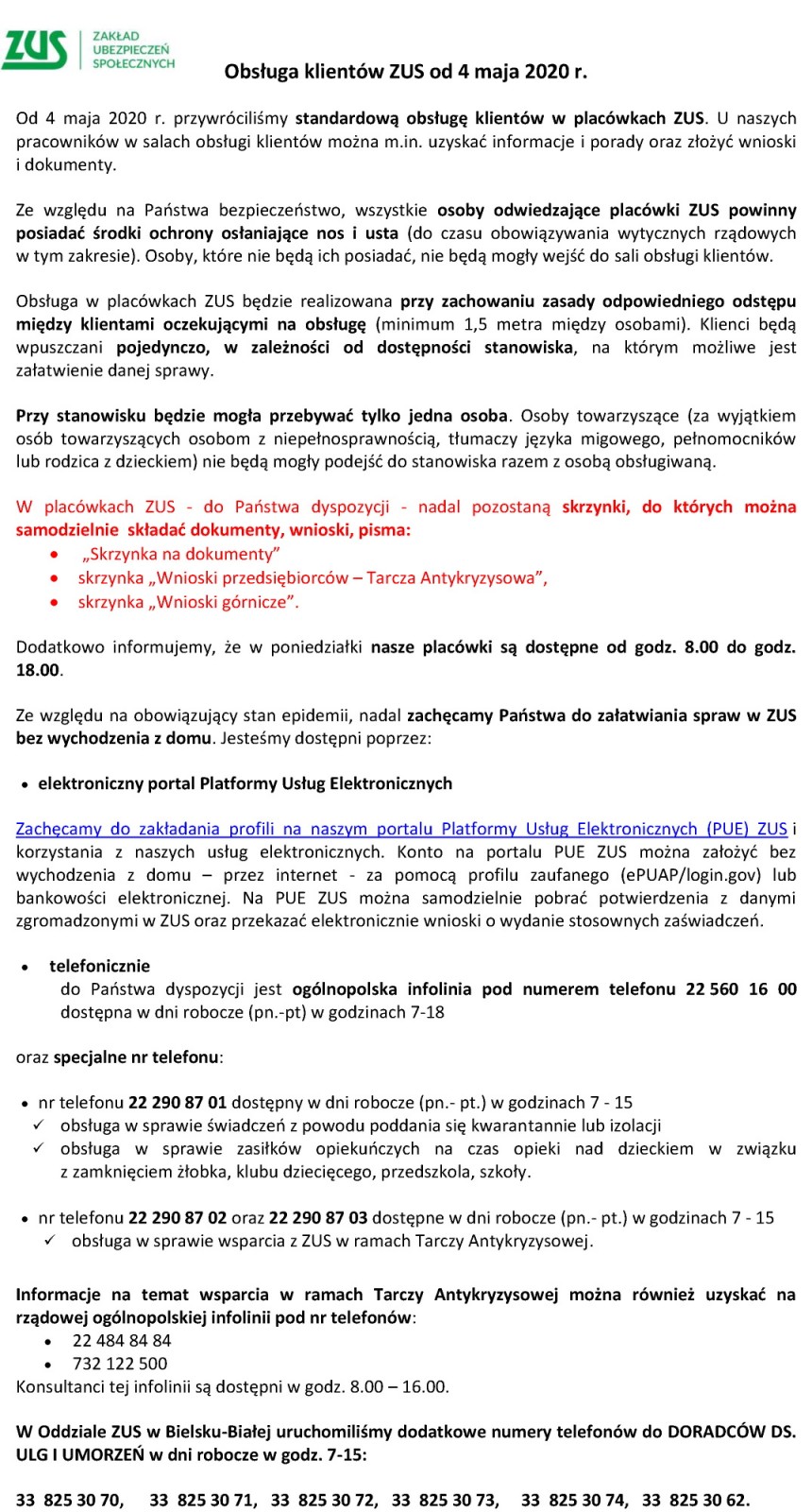 Obsługa klientów ZUS od 4 maja 2020 r.