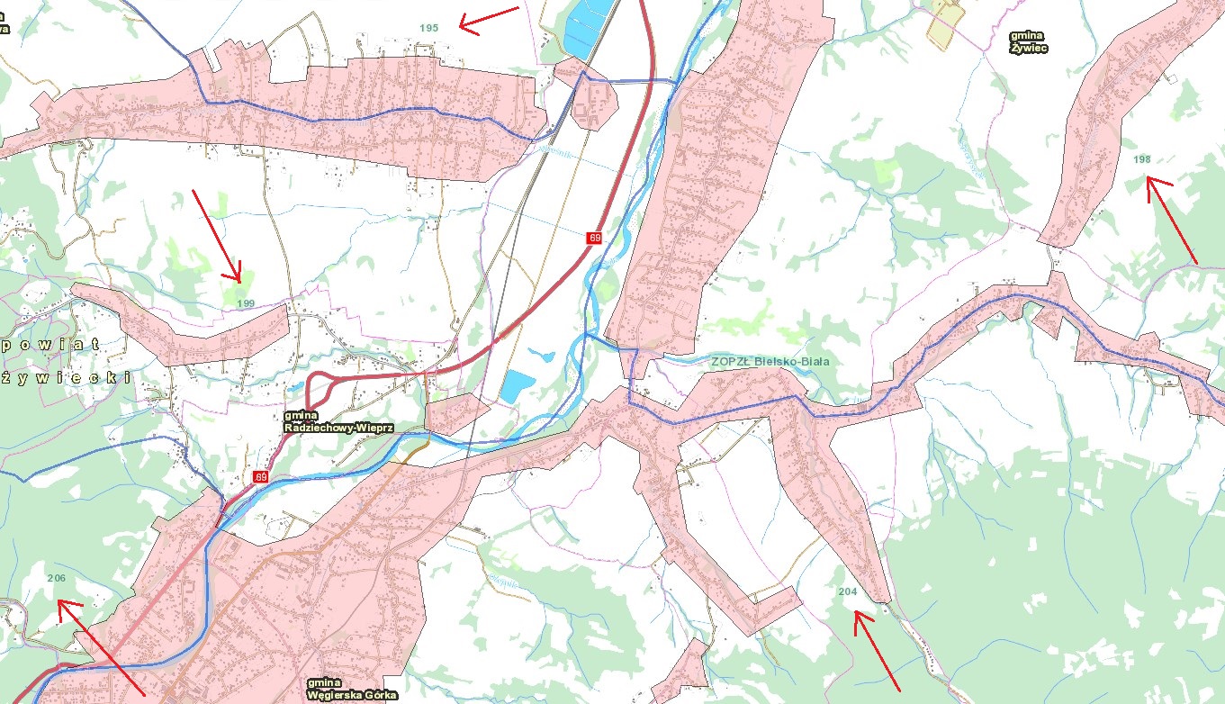 195 - Od północy granica obwodu biegnie od zapory Tresna brzegiem Jeziora Żywieckiego, a z kolei brzegiem rzeki Soła do miejscowości Radziechowy -Wieprz. Tu przechodzi na drogę i obok przystanku PKP Radziechowy-Wieprz dochodzi do szosy Rajcza - Żywiec, stąd na południe do krzyżowki z drogą lokalną Radziechowy. Tu skręca na zachód i biegnie drogą przez miejscowość Radziechowy do skrzyżowania z drogą lokalną do Twardorzeczki. Następnie skręca w kierunku północno - zachodnim i drogą lokalną obok wapiennika Radziechowy przez miejscowości: Twardorzeczka, Lipowa, Poddzielec, Słotwina, Kalna do przecięcia się z drogą polną z osiedla koło Niklonki (przed laskiem Łodygowskim). Tu skręca na północ do przecięcia się z drogą lokalną Godziszka - Łodygowice. Dalej na wschód na wysokość gospodarstwa Ob. Kufla, skąd w kierunku północnym drogą polną do zabudowań "Na Grapę". Dalej na północ przecinając rzekę Żylicę, biegnie drogą śródpolną do przecięcia się z szosą nr 94 Bielsko - Żywiec. Z kolei drogą lokalną przez Łodygowice Górne do miejscowości Huciska. Dalej drogami leśnymi obok góry Groniczek, Małą Górę do osiedli na polanach Babczaki, skąd na północ (granicą lasów państwowych Nadleśnictwa Jeleśnia) do drogi grzbietowej Czupel – Magurka mijając po lewej stronie polanę Rogalka. Tu skręca na wschód drogą grzbietową koło starego schroniska przez górę Czupel do szlaku turystycznego (czerwony). Następnie tym szlakiem na południe do północnej granicy łąki Sikorówka, dalej północną granicą tej łąki do punktu warstwicowego 2864, dalej drogą warstwicową i na wysokości polany Filarowa w kierunku południowym drogą grzbietową biegnącą po zachodniej stronie polany Filarowa w linii prostej do potoku Roztok, obok gajówki Cieniowa. Potokiem tym na wschód do jego ujścia w rzece Soła (przy zaporze) tj. do punktu wyjściowego.