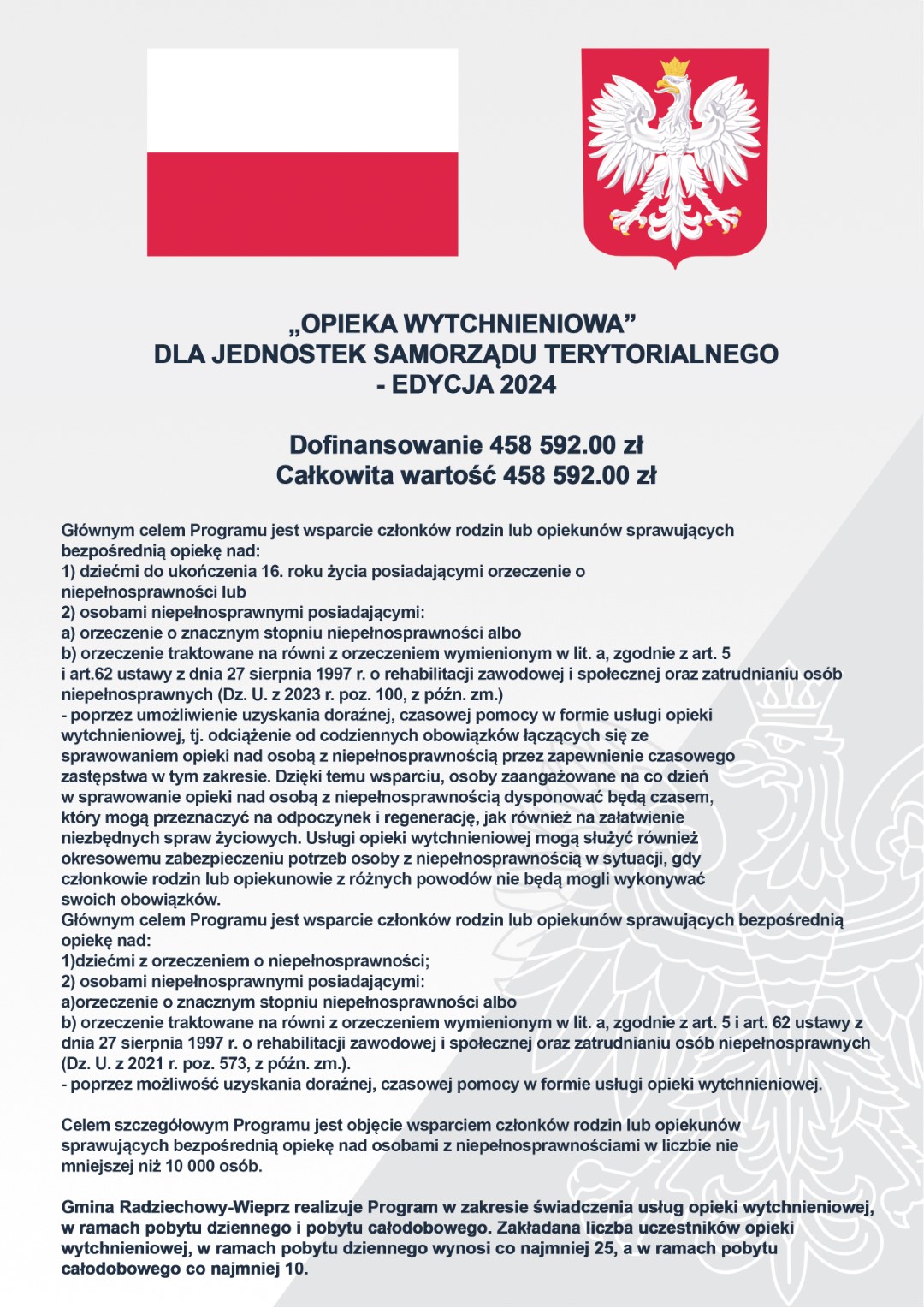 Gmina Radziechowy-Wieprz realizuje Program w zakresie świadczenia usług opieki wytchnieniowej, w ramach pobytu dziennego i pobytu całodobowego. Zakładana liczba uczestników opieki wytchnieniowej, w ramach pobytu dziennego wynosi co najmniej 25, a w ramach pobytu całodobowego co najmniej 10.