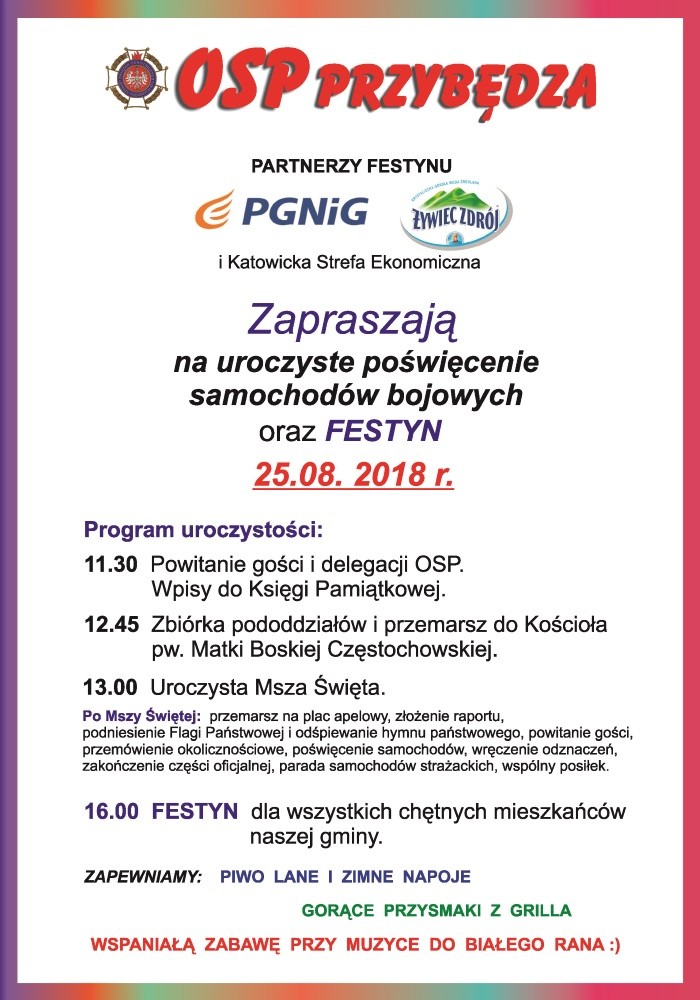 OSP Przybędza wraz z Partnerami zapraszają na FESTYN oraz uroczyste poświęcenie samochodów bojowych Dodano: 14.08.2018 r. Kategoria: Kultura