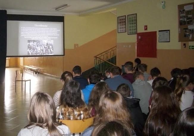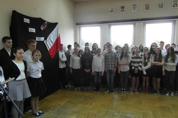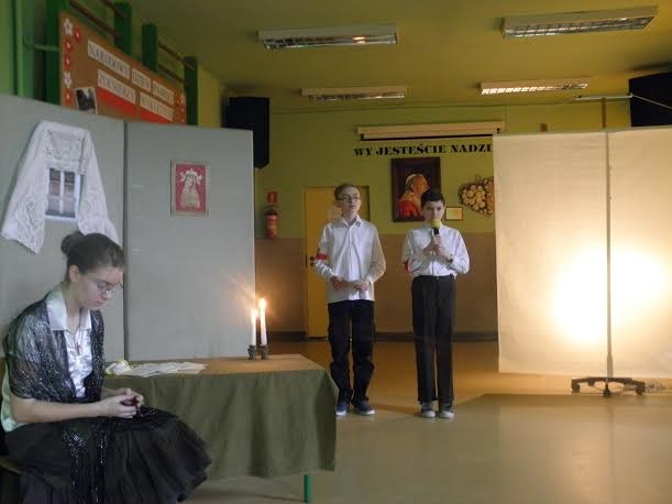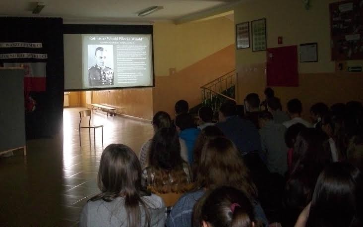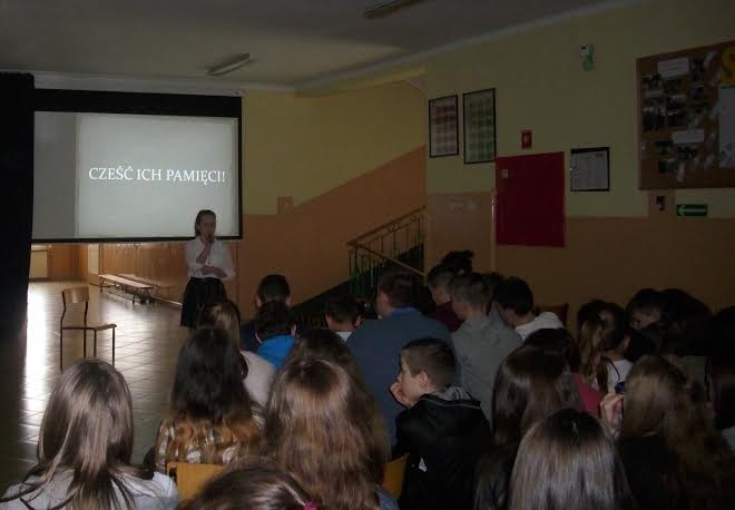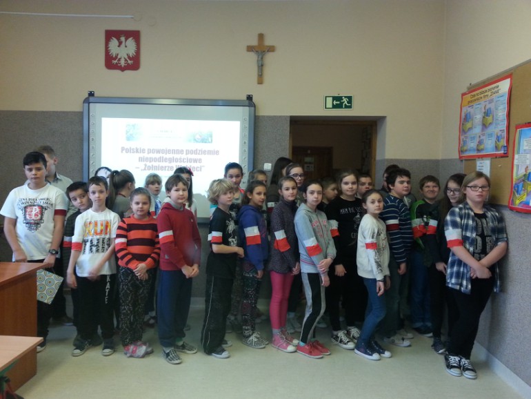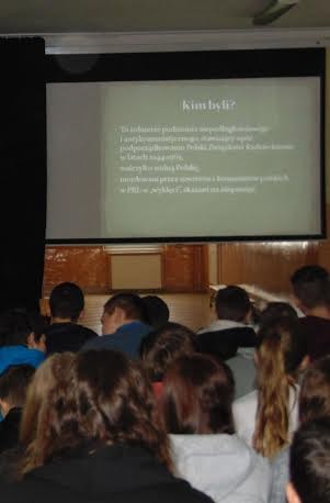 Gimnazjaliści przygotowali prezentację dotyczącą wybranych żołnierzy oraz powodów, dla których nie złożyli oni broni. Kilka slajdów dotyczyło żyjącego żołnierza z oddziału "Bartka" kpt. Władysława Foksy, który odwiedził gimnazjum w 2012 r. (załączamy slajd z prezentacji), wspomniany został także Edward Chudziec ps. "Brzoza" - zasłużony mieszkaniec gminy Radziechowy-Wieprz Ponadto młodzież zaprezentowała montaż słowno-muzyczny, w którym wykorzystano teksty m. in. Zbigniewa Herberta, Artura Oppmana oraz fragmenty pamiętnika Danuty Siedzikówny ps. "Inka".