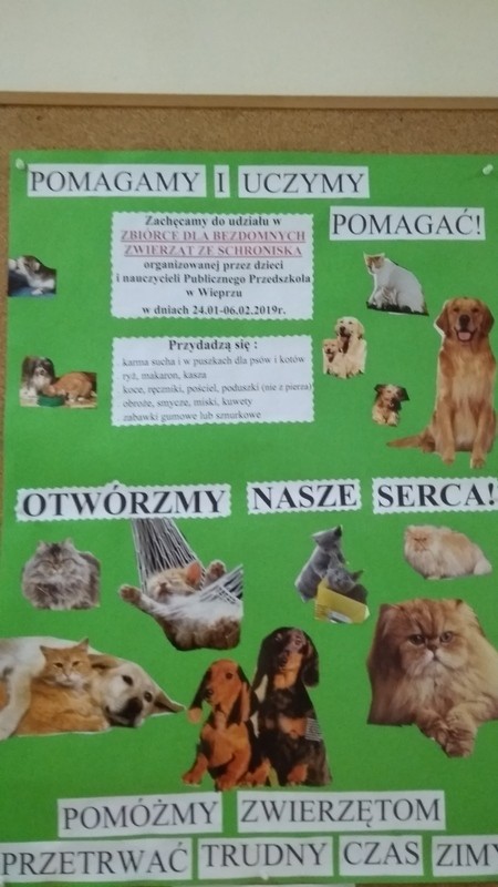 Dlatego w naszym przedszkolu zorganizowana została zbiórka karmy i akcesoriów  dla zwierząt przebywających w schronisku w Żywcu. Celem tego przedsięwzięcia była poprawa standardu pobytu zwierząt w schronisku, kształtowanie postawy przyjaciela zwierząt oraz wdrażanie dzieci i osób dorosłych do aktywnego udziału w zbiórce.