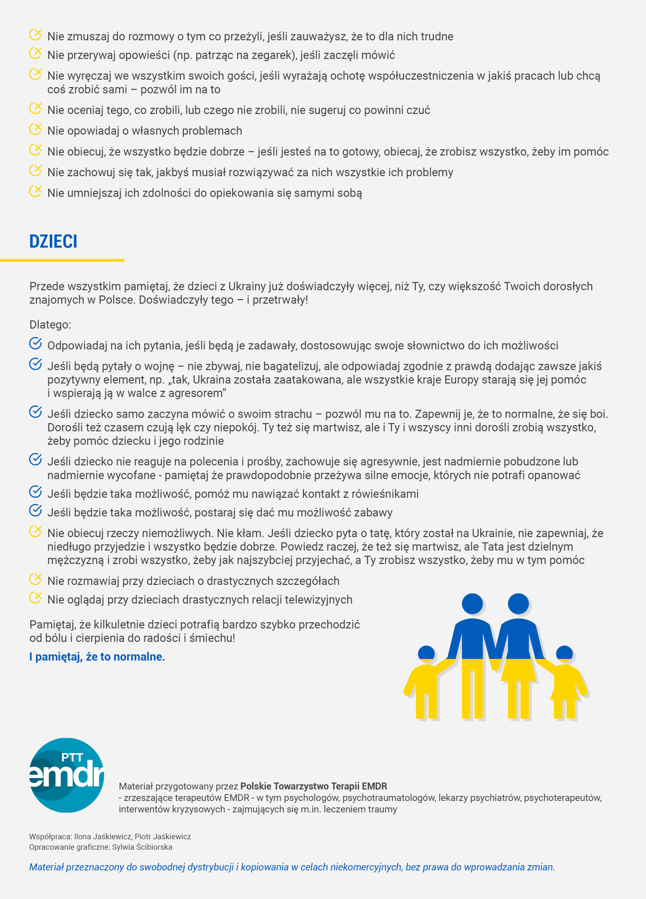 "Jak rozmawiać z rodzinami z Ukrainy": Poradnik dla osób przyjmujących uchodźców z Ukrainy Dodano: 07.03.2022 r. Kategoria: Pomoc dla Ukrainy Krótki poradnik dla osób przyjmujących uchodźców z Ukrainy.