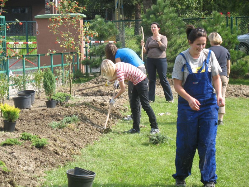 Współrealizatorem projektu jest Zespół Szkół Budowlano-Drzewnych: uczniowie Technikum Architektury Krajobrazu wraz ze swymi nauczycielami Panią Zofią Oziębło i Panią Katarzyną Tomaszek, które wykonują prace projektowo-aranżacyjne – przez kilka tygodni w pocie czoła przygotowują teren, spulchniają ziemię, plewią, sadzą, umacniają, podlewają, zabezpieczają… Początkowo wiele osób – zwłaszcza postronnych – dziwi obecność młodzieży w roboczych drelichach na terenie naszej szkoły. Jednak wzajemne sympatie z dnia na dzień wzrastają, Wraz z pojawiającymi się roślinkami i zmieniającym się obliczem terenu przyszkolnego rośnie nasz podziw w zaangażowanie oraz wkład pracy starszych kolegów – licealistów. Słychać szepty trzecioklasistów, iż warto się zastanowić nad własną przyszłością i – być może – wejść w progi tej szkoły. Za cały trud, wielogodzinny wysiłek fizyczny i wkład emocjonalny – serdecznie Wam dziękujemy! Mamy nadzieję, że takie właśnie praktyczne działania będą Wam pomocą i radością w przygotowaniach do przyszłego zawodu.