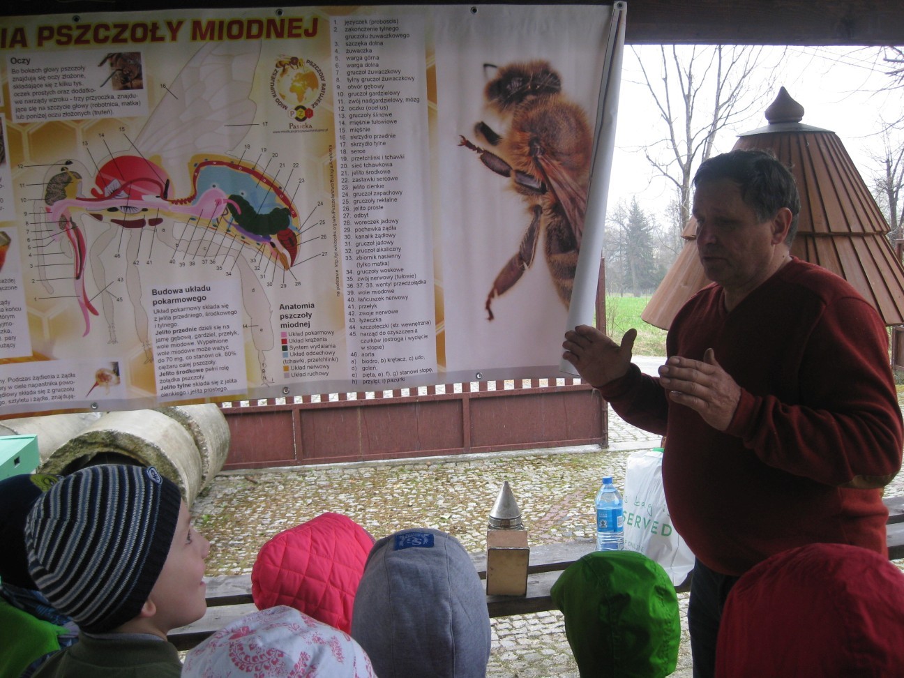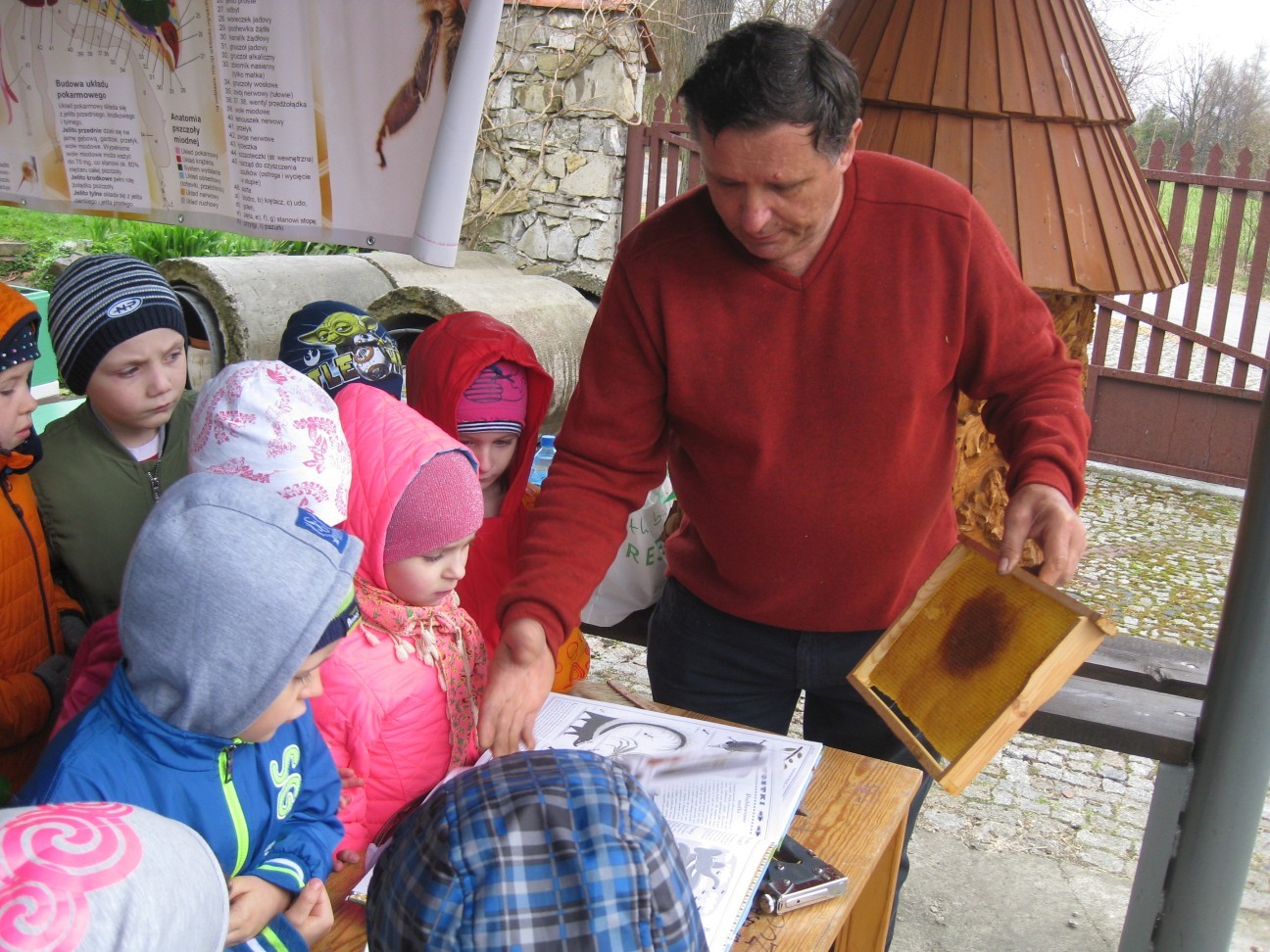 Poszukiwania informacji na temat wykorzystania w przyszłości potencjału przyrodniczego i turystycznego zaprowadziły nas tym razem do pasieki Państwa Ozimińskich „Radziechowska Barć”. Mistrz pszczelarski Pan Tadeusz Ozimiński przygotował dla przedszkolaków profesjonalne zajęcia edukacyjne na temat historii pszczelarstwa i jego obecnej sytuacji w kraju i na świecie. Mało kto z nas wiedział, że pszczoły istniały na Ziemi już w czasach dinozaurów. Fascynująca organizacja umożliwiła tej owadziej społeczności przetrwanie przez setki milionów lat. Jednakże obecnie największym zagrożeniem dla świata pszczół i wszelkich wartości płynących z ich istnienia jest niestety człowiek i tworzona przez niego cywilizacja. Są kraje, gdzie zagłada owadów doprowadziła do tego, że ludzie muszą pędzelkami zapylać drzewa owocowe! Na szczęście są podejmowane działania ratunkowe. Wymaga to wiedzy i pasji wielu ludzi, jak również wzrostu ogólnej świadomości społeczeństwa na temat zagrożeń. To nasi wychowankowie w przyszłości będą podejmowali decyzje, mające wpływ na stan środowiska naturalnego. Przedszkolaki miały okazję obejrzeć nowocześnie zorganizowane przedsiębiorstwo pszczelarskie i porównać jego rozwój z informacjami historycznymi. Państwo Ozimińscy zadbali o ocalenie od zapomnienia uli, których wiek sięga często stu lat. Podsumowaniem warsztatów pszczelarskich dla przedszkolaków była wspólna konsumpcja miodu i pyłku pszczelego z Radziechowskiej Barci. Dziękujemy Panu Tadeuszowi Ozimińskiemu za wartościowe spotkanie i pozostaje nam mieć nadzieję, że zdobyta przez naszych przedszkolaków wiedza przyczyni się w przyszłości do przetrwania i rozwoju pszczelarstwa w naszej małej ojczyźnie. Pozwólmy pszczołom zapylać rośliny i wytwarzać miód.