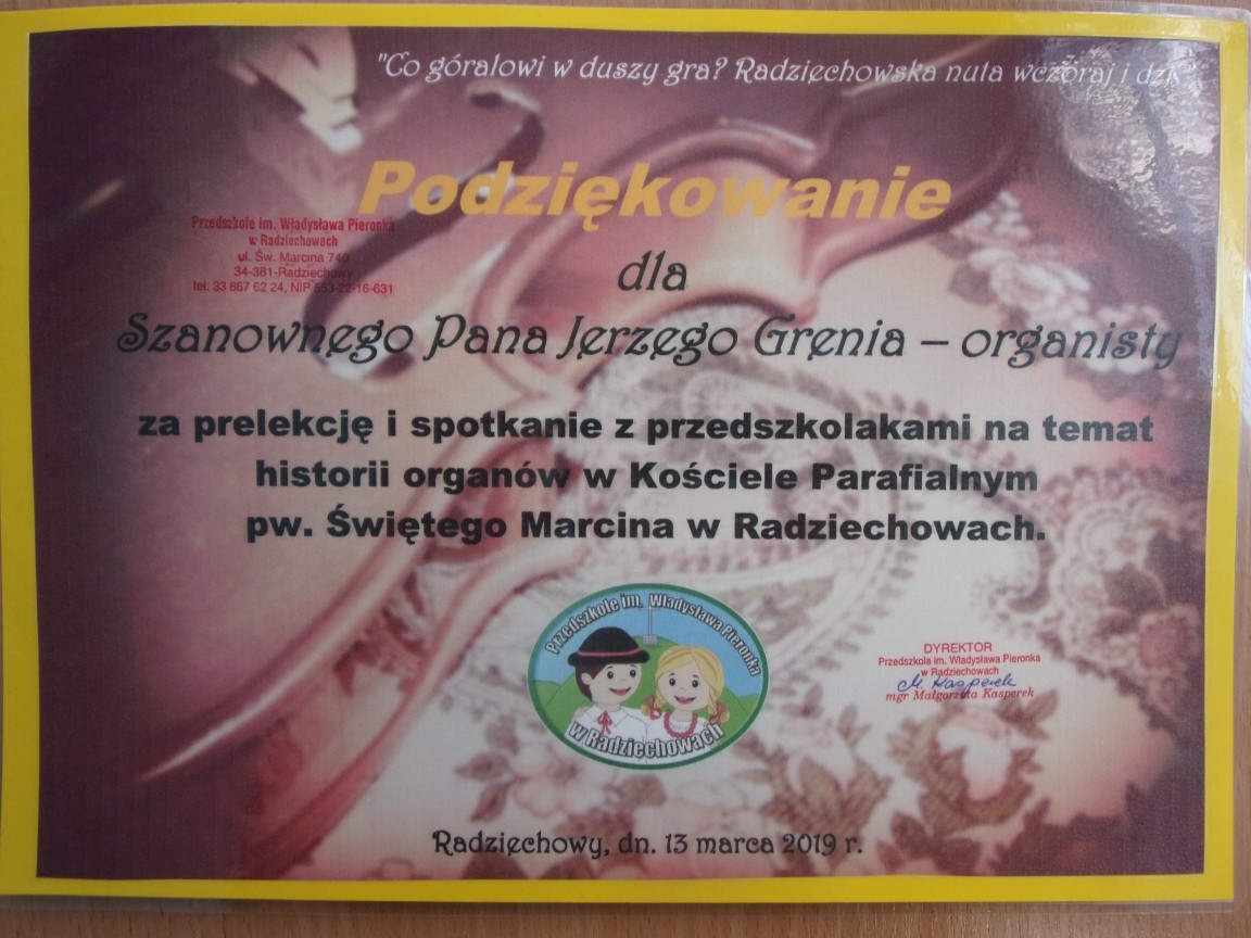 Nauczyciele i wychowankowie Przedszkola im. Władysława Pieronka w Radziechowach postanowili zająć się  w tym roku tematyką  życia muzycznego w naszej miejscowości. Realizację regionalnego projektu „Co góralowi w duszy gra? Radziechowska nuta wczoraj i dziś” zainaugurowała wycieczka do Kościoła pw. Św. Marcina oraz spotkanie z Ks. Dziekanem Piotrem Pokojnikowem i Panem Jerzym Greniem – organistą.