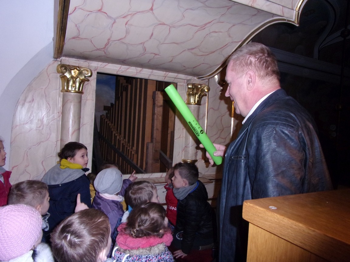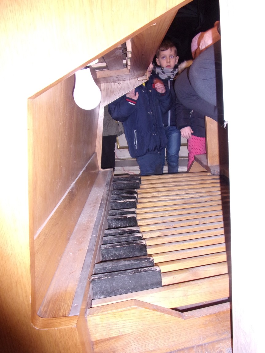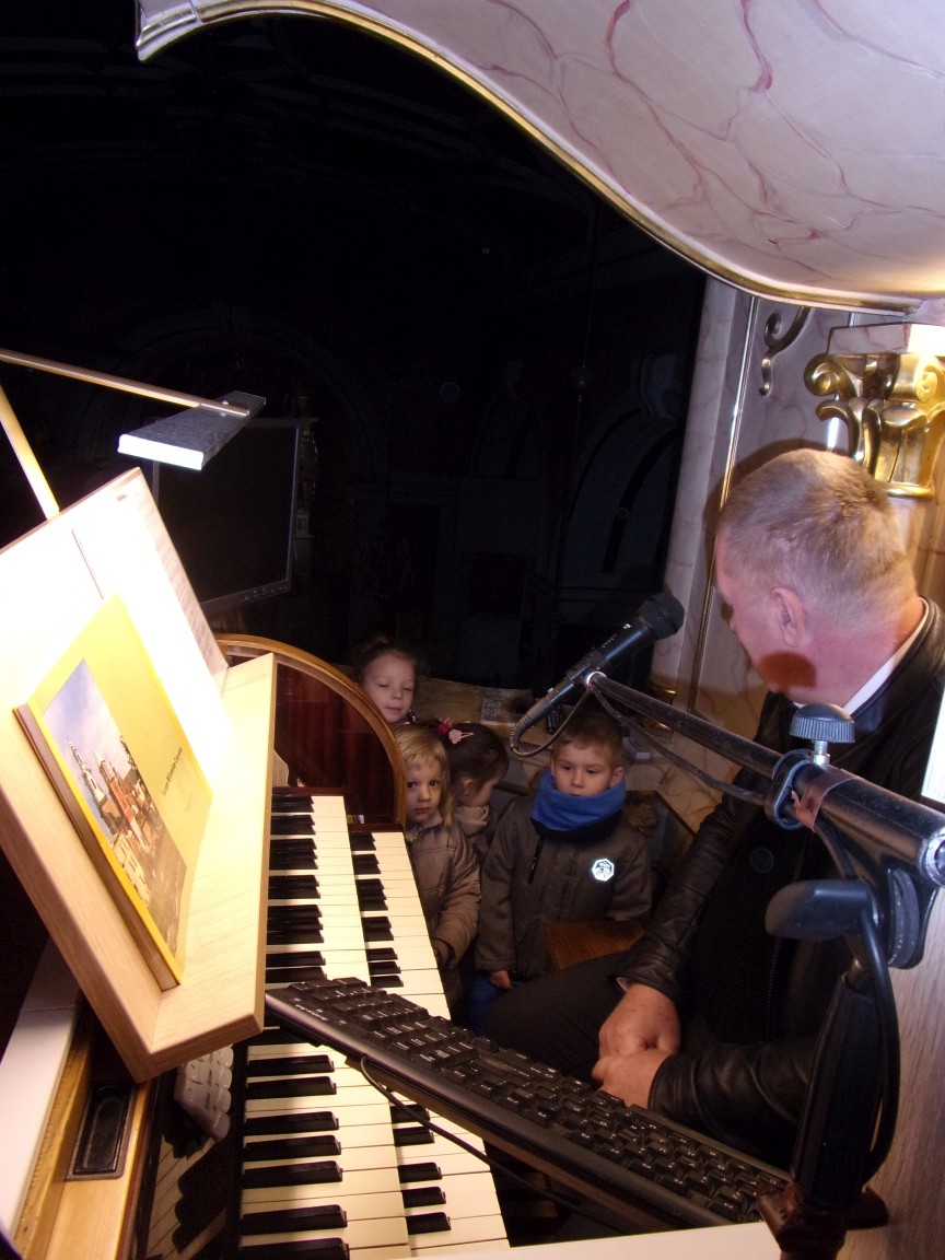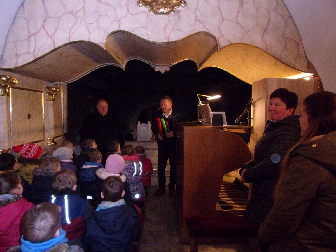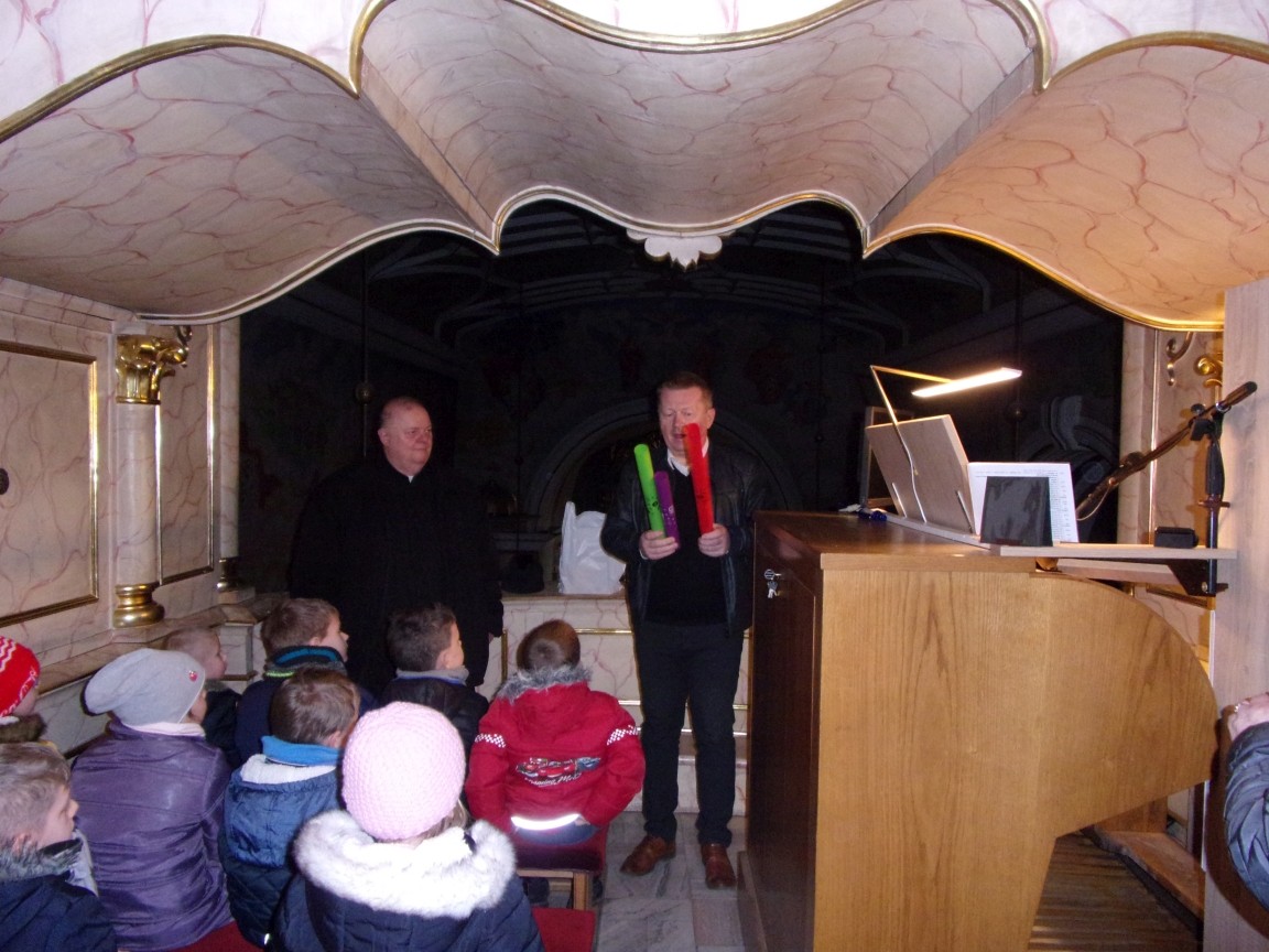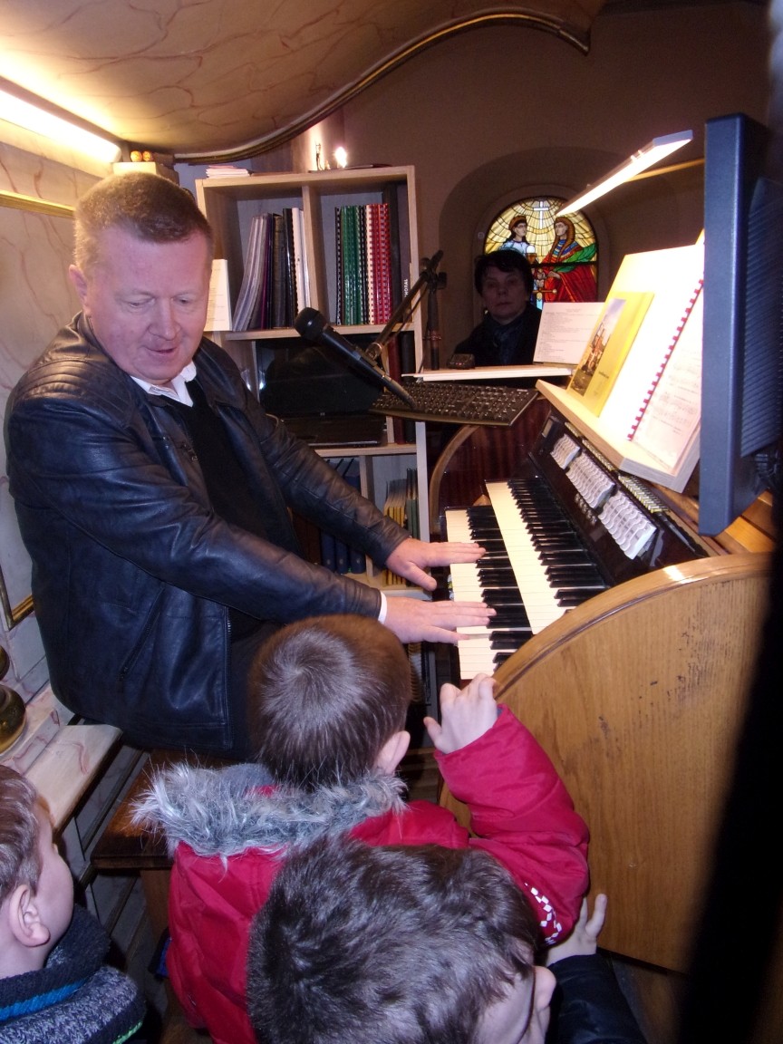 Organista Pan Jerzy Greń w niezwykle przystępny sposób przybliżył przedszkolakom i ich wychowawczyniom wszystkie tajniki królewskiego instrumentu. Z zapartym tchem dzieci słuchały granych przez niego utworów Jana Sebastiana Bacha. Entuzjazm wzbudził fragment  etiudy zagrany przez Pana Jerzego… nogami! Dzieci podziwiały imponującą konstrukcję organów kościelnych. Dowiedziały się, że przepiękna fasada organów widoczna dla wszystkich odwiedzających Kościół, to zaledwie niewielka część królewskiego instrumentu. Pan Jerzy opisał  działanie piszczałek organowych (osiągających nawet  5 m wysokości), wentylatora i pulpitu z trzema klawiaturami. Zaprezentował też historyczną już dzisiaj funkcję „kalikanta”, mechanicznie napełniającego miechy organowe powietrzem. Zachwyt dzieci wzbudziło malowidło na stropie chóru, o którym Ks. Jan Kracik napisał w swoim opracowaniu „Radziechowy. Parafia z jagiellońskich czasów” : „Na chórze- malowana na platformie muzykalna św. Cecylia patronuje pracy pana organisty, a szyba o zachodzie słońca przepuszcza promienie przez czerwone i niebieskie szaty Barbary i Katarzyny”.  Z całego serca dziękujemy Księdzu Dziekanowi oraz Panu Jerzemu Greniowi za niezwykle wartościowe spotkanie.